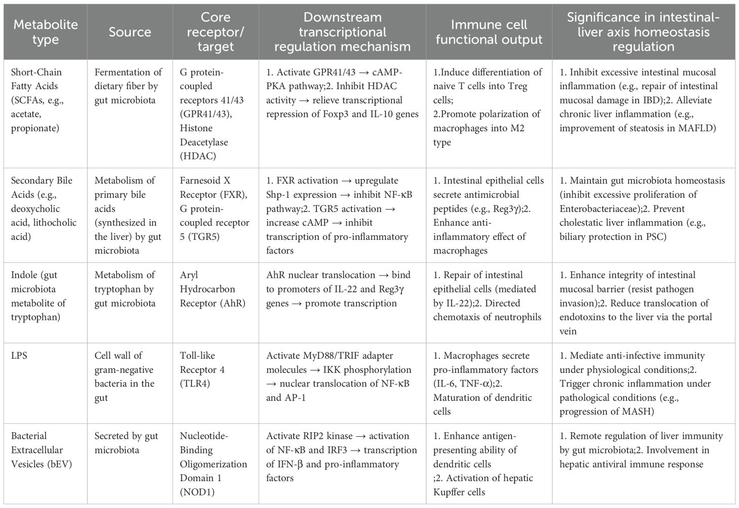 The gut-liver axis precisely regulates immune function via a cascading “metabolite-specific receptor-immune cell functional phenotype” model (104). Gut microbial metabolites (e.g., SCFAs, indoles) and liver-derived metabolites (e.g., secondary bile acids) bind to specific receptors on immune cells or intestinal epithelial cells, initiating downstream transcriptional programs that ultimately define the immune response as either tolerogenic or pro-inflammatory. This model challenges the traditional immunological paradigm that “immune cell function is independent of the metabolic microenvironment” and clarifies the core molecular mechanism underlying the gut-liver axis as a cross-regulatory unit linking metabolism and immunity (Table 1) (105).