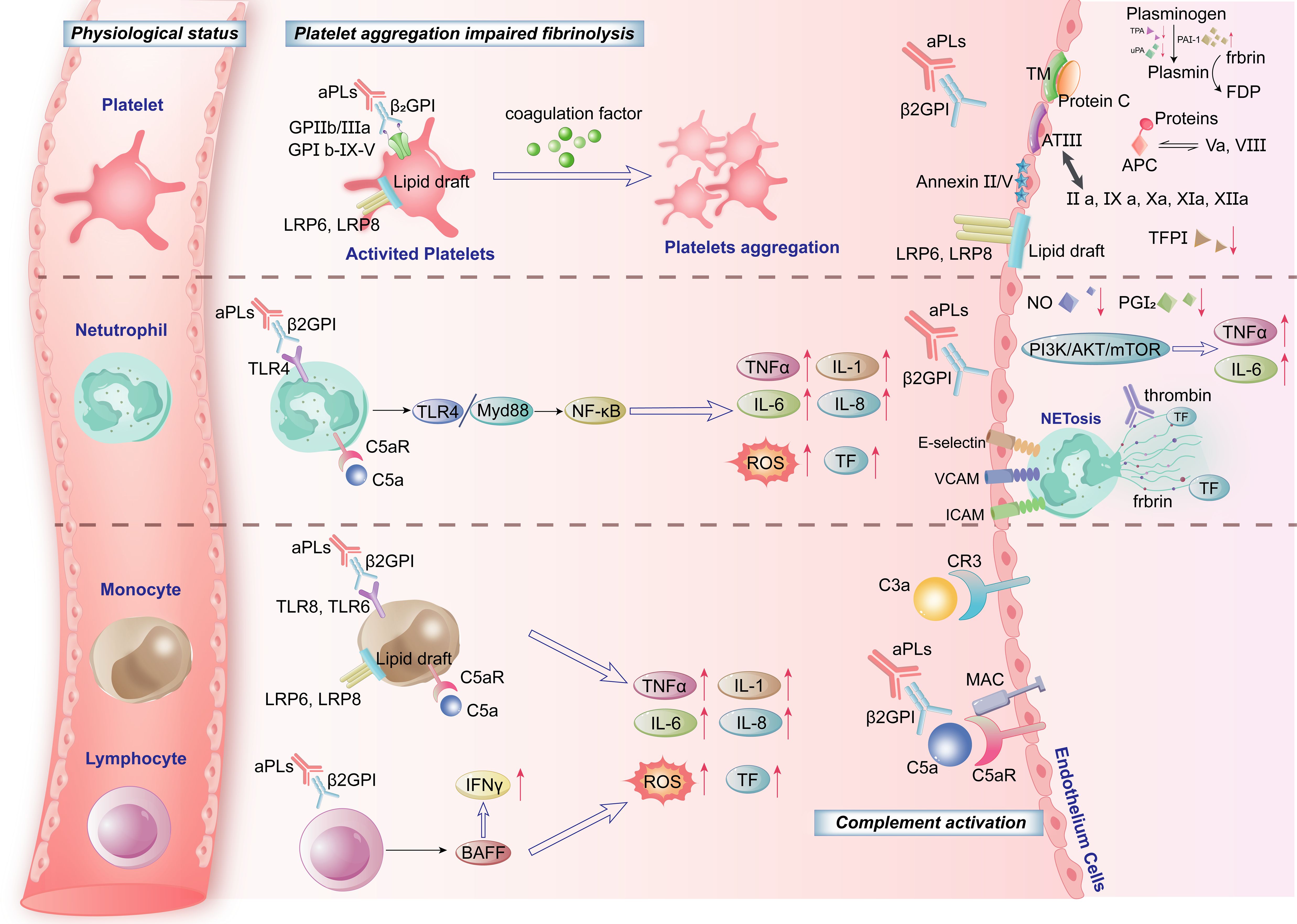 aPLs primarily activate endothelial cells (ECs), platelets, monocytes, and neutrophils through interactions with phospholipid-binding proteins, phospholipids (PL), or their complexes. This initiates the coagulation cascade and promotes thrombosis. Under physiological conditions, ECs maintain blood flow by releasing nitric oxide (NO) and prostaglandin I2 (PGI2), which inhibit platelet aggregation and clotting factor activation. Additionally, ECs express tissue factor pathway inhibitors (TFPI) and thrombomodulin (TM) and produce urokinase-type plasminogen activators (u-PA) and tissue plasminogen activators (t-PA) to promote fibrinolysis. aPL activation suppresses these protective molecules while upregulating tissue factor (TF) and cell adhesion molecules, enhancing leukocyte and platelet adhesion (6–8).