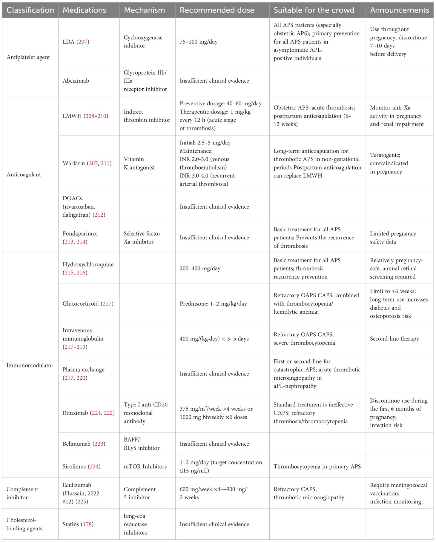 Hydroxychloroquine (HCQ) was developed in 1995 by modifying the hydroxyl group of chloroquine, originally extracted from Cinchona bark for malaria treatment. Beyond malaria, HCQ is widely used for conditions affecting metabolic, cardiovascular, hematologic, and autoimmune systems, as well as bacterial and viral infections, including rheumatoid arthritis, SLE, dermatomyositis, and Sjögren’s syndrome. As a TLR7 and TLR9 antagonist, HCQ has anti-inflammatory, anti-aggregation, and immunomodulatory properties. Its mechanisms may include stabilizing lysosomal membranes by inhibiting phospholipase activity, blocking aPL binding to cells, raising extracellular and intracellular pH, and inhibiting complement-dependent antigen-antibody responses (127, 128). Placental toxicology studies indicate no adverse effects on placental tissue and suggest potential anti-inflammatory protection. Experimental models demonstrate that HCQ can restore the biological function of aPL-damaged trophoblastic cells and protect against placental and fetal neurodevelopmental abnormalities (129). HCQ reduces aPL-induced platelet aggregation and coagulation, inhibits anti-β2GPI antibody formation, and lowers thrombosis risk. Studies suggest that HCQ may reduce aPL titers in SLE patients and APS animal models, effectively preventing thrombosis (130).