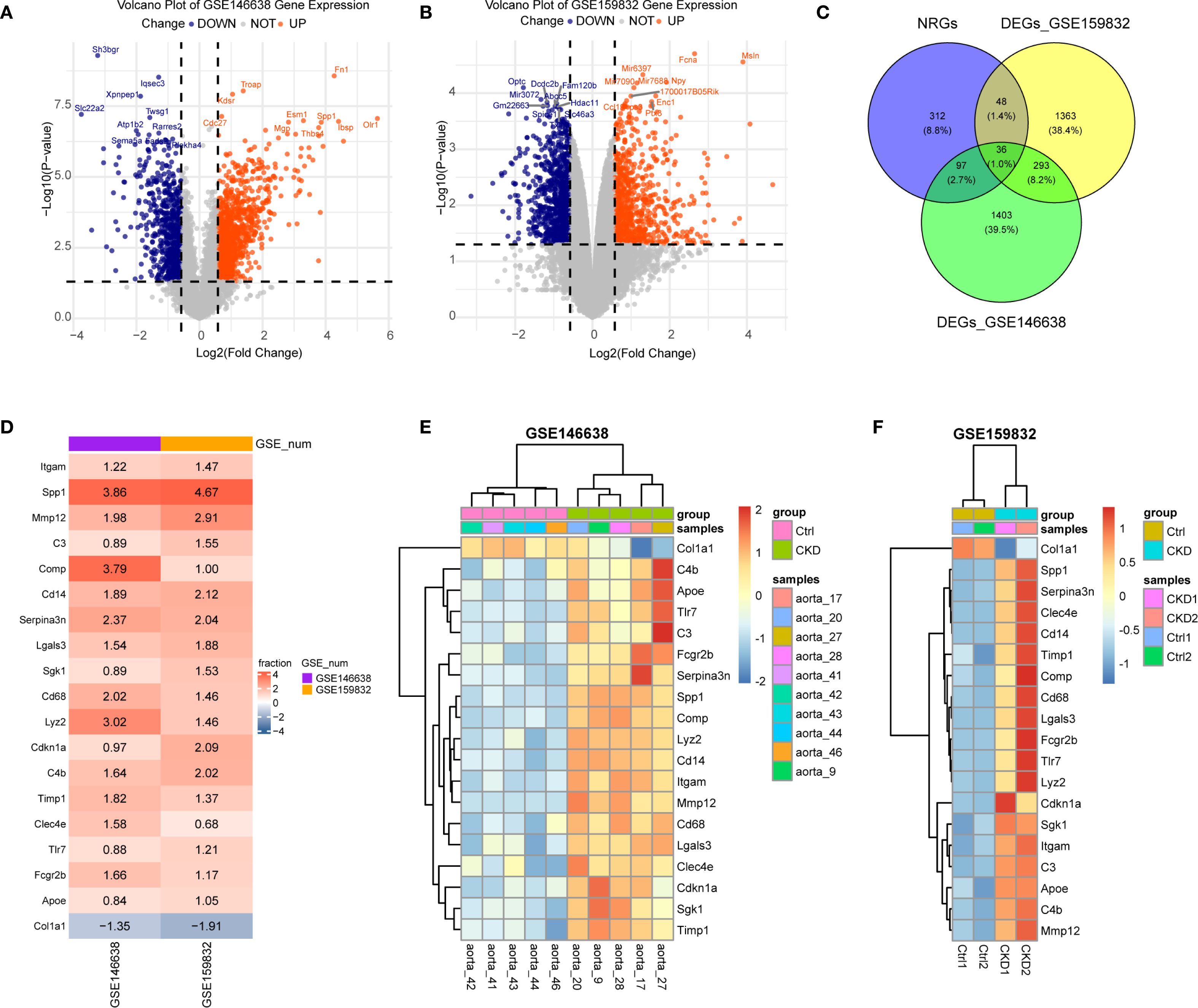 Figure 1. Identification of differentially expressed NET-related genes (NRGs) in CKD-associated vascular calcification. (A, B) Volcano plots of differentially expressed genes (DEGs) in GSE146638 (A) and GSE159832 (B). Red dots, up-regulated genes; blue dots, down-regulated genes. (C) Venn diagram showing the overlap between DEGs and NRGs. (D) Robust rank aggregation (RRA) reveals consistently dysregulated NRGs in GSE146638 and GSE159832. Red, up-regulated; blue, down-regulated. (E, F) Expression levels of RRA-selected NRGs in CKD versus control groups for GSE146638 (E) and GSE159832 (F).