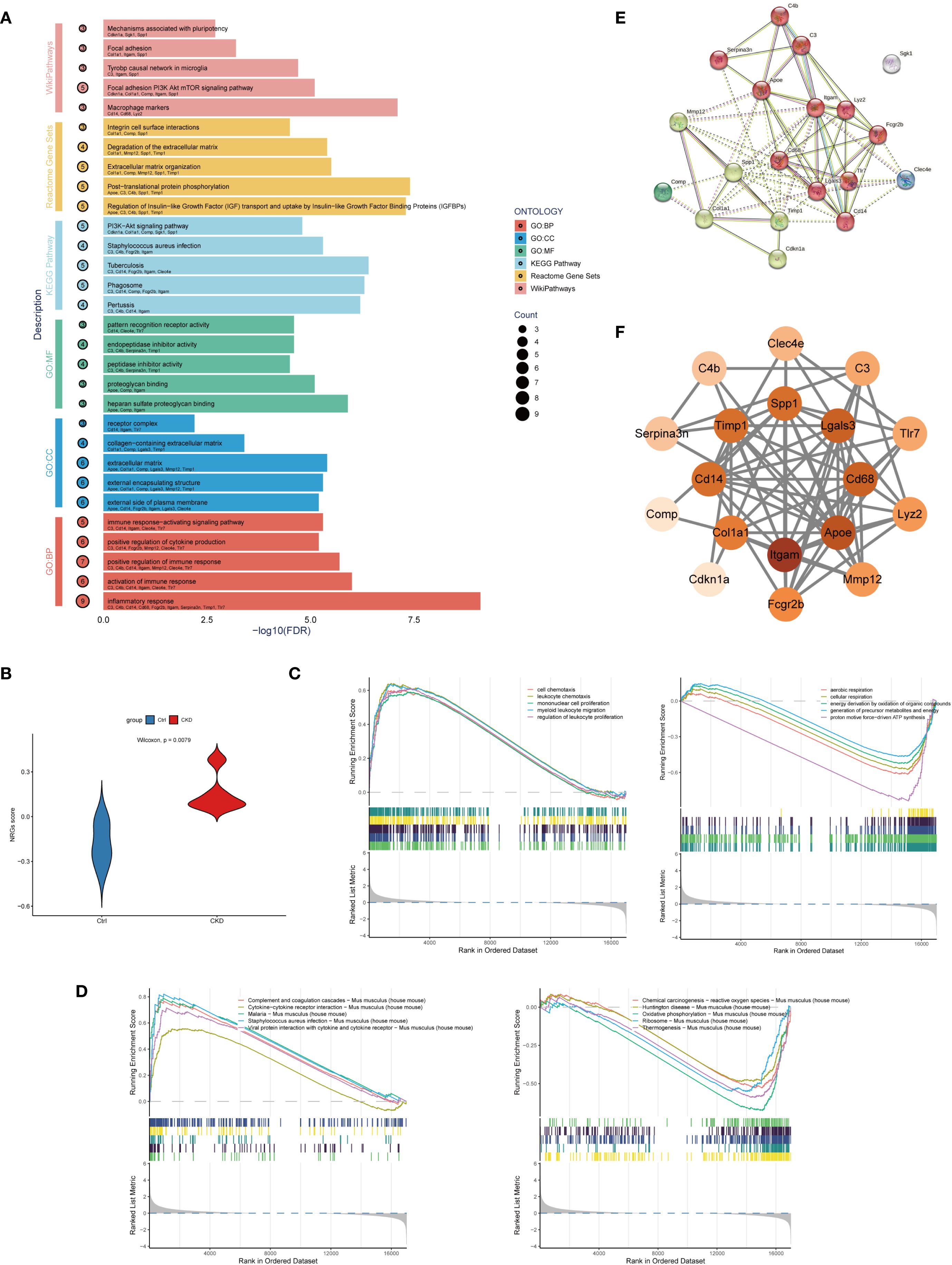 Figure 2. Functional analysis of NET-related candidate genes in CKD-associated vascular calcification. (A) Enrichment analysis of Gene Ontology (GO), KEGG, Reactome, and WikiPathways. The y-axis shows pathways, the x-axis shows statistical significance (–log10 FDR), and bubble size indicates gene count. (B) Violin plot comparing NET-related gene set variation analysis (GSVA) scores between CKD and control groups in the GSE146638 dataset (p < 0.01, Wilcoxon test). (C) Gene Set Enrichment Analysis (GSEA) based on GO: Biological Process (BP) terms in CKD and control samples. Top 5 enriched terms are shown. (D) GSEA based on KEGG pathways in CKD and control samples. Top 5 enriched terms are shown. (E) Protein–protein interaction (PPI) network constructed using the STRING database with a minimum interaction score of 0.4. The network includes 19 nodes and highlights extensive connectivity among NET-related genes. (F) Hub gene subnetwork visualized in Cytoscape using the cytoHubba plugin. Top-ranked genes based on degree centrality include Itgam, Apoe, Lgals3, Cd68, and Timp1.