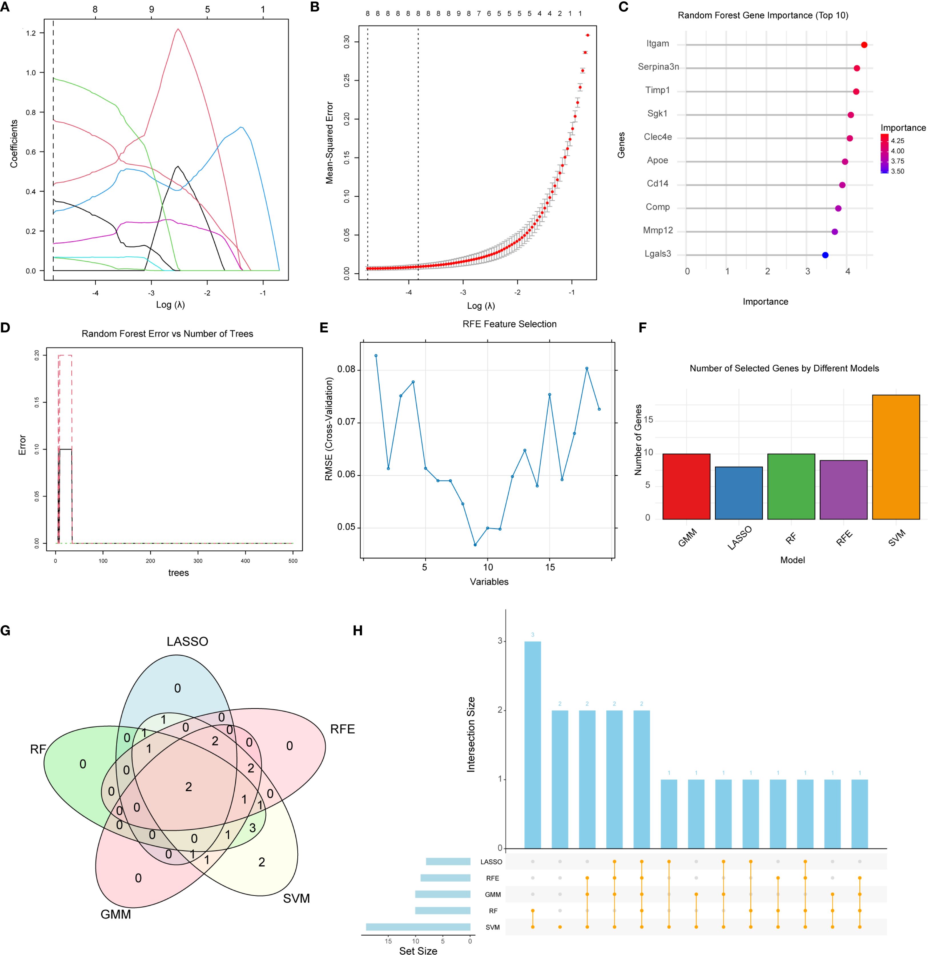 Figure 3. Identification of key NET-related genes by machine learning. (A, B) LASSO regression: (A) coefficient trajectories over log(λ); (B) 10-fold cross-validation for optimal λ. (C) Random Forest variable-importance scores; top genes exhibit strongest discrimination. (D) RF error-rate curve showing convergence with increasing trees. (E) SVM-based recursive feature elimination (RFE): RMSE versus retained variables. (F) Bar chart summarizing gene counts obtained by five algorithms (LASSO, RF, RFE, GMM, SVM). (G) Venn diagram displaying overlapping genes; Mmp12 and Comp were selected by all methods. (H) Upset plot illustrating intersections among gene sets across algorithms.