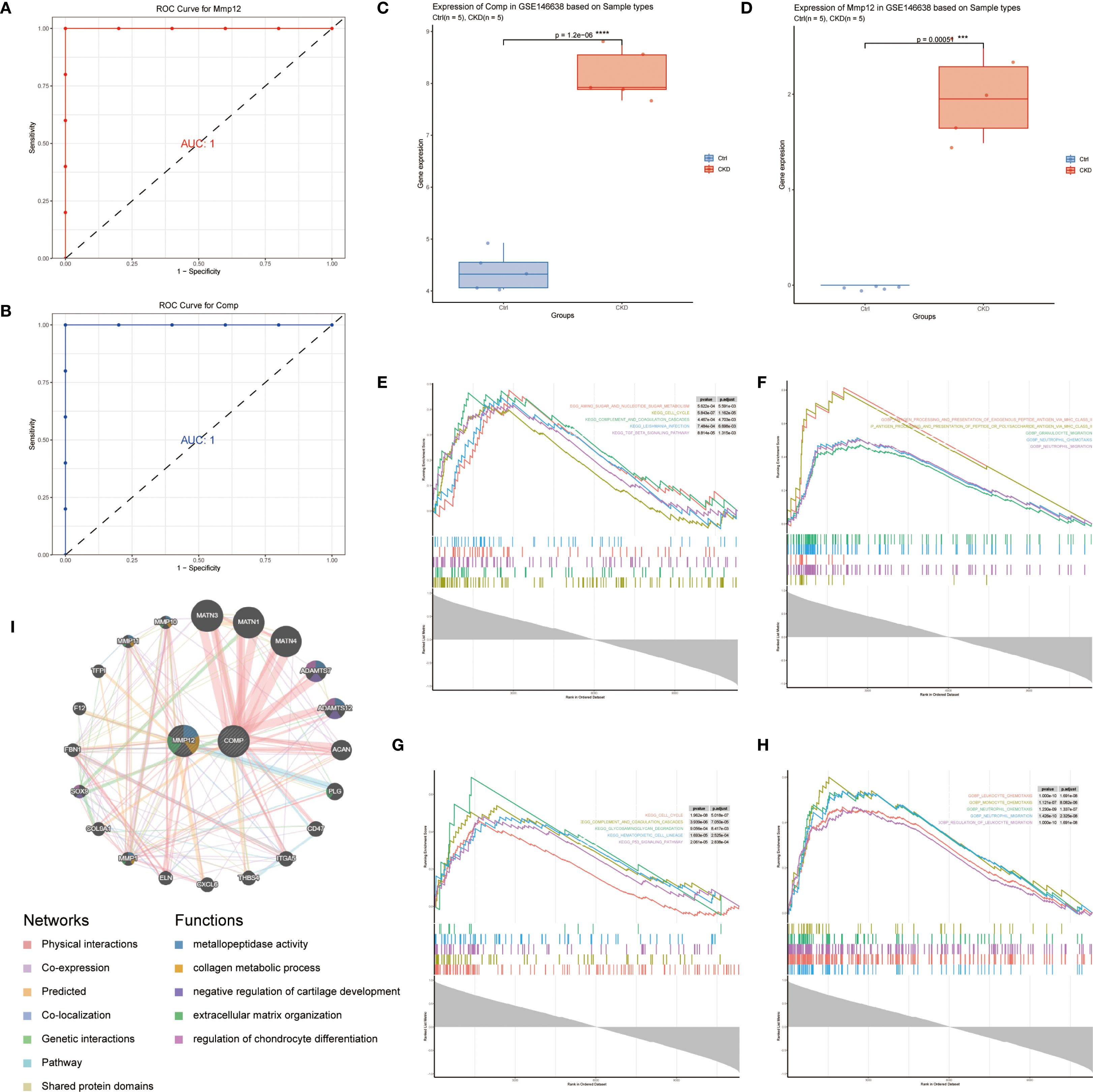 Figure 4. Diagnostic performance and functional characterization of key NET-related genes. (A, B) ROC curves for Mmp12 (A) and Comp (B) in the GSE146638 dataset; both yield AUC = 1.0. (C, D) Box plots showing significantly elevated Comp (C) and Mmp12 (D) expression in CKD samples versus controls (p < 0.001, Wilcoxon test). (E–H) GSEA results for top-ranked genes correlated with Comp (E, F) and Mmp12 (G, H); KEGG pathways are on the left, GO: BP terms on the right. (I) GeneMANIA co-expression network illustrating functional interactions of Mmp12 and Comp with related genes (co-expression, shared pathways, and physical binding).