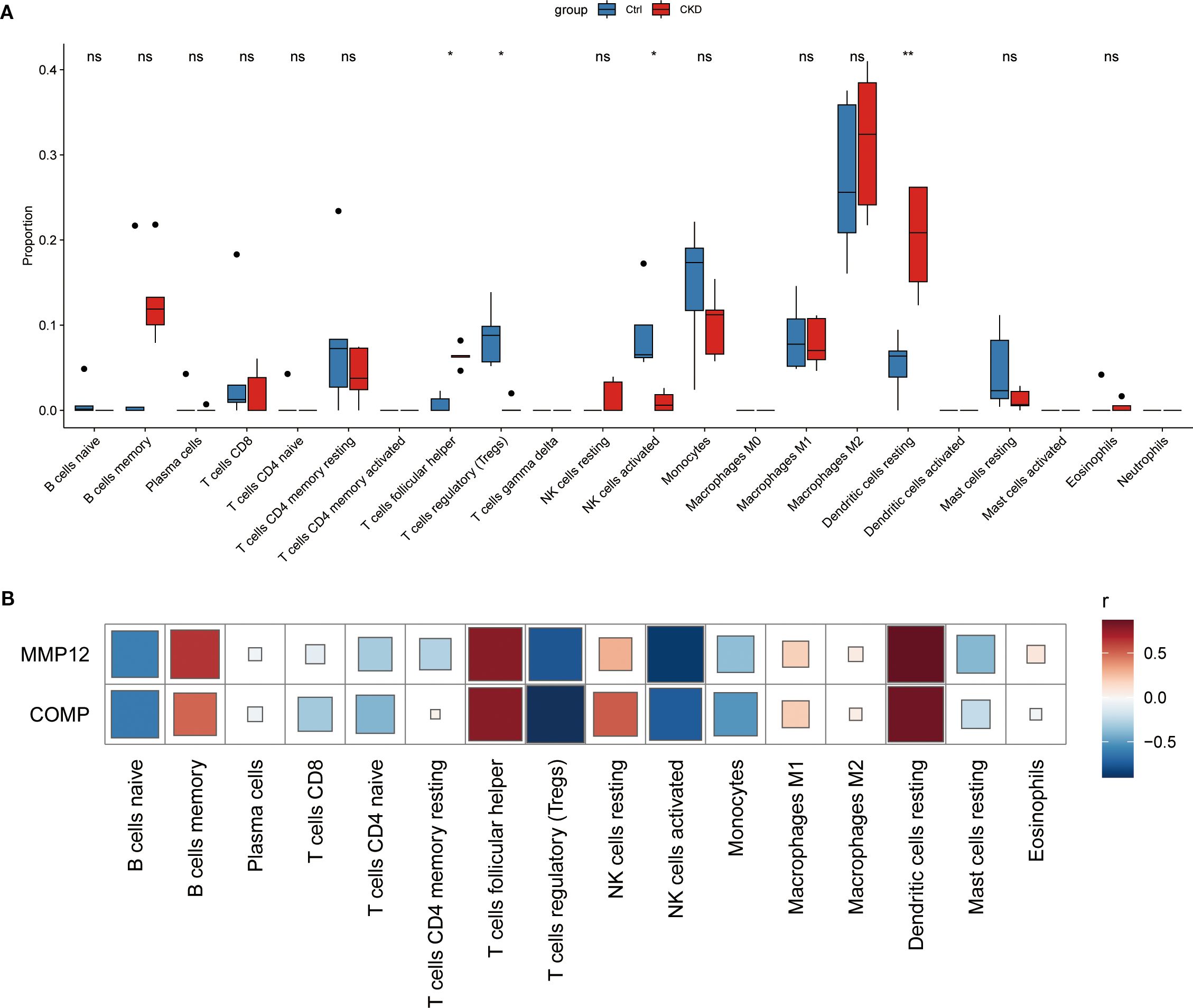 Figure 5. Immune-cell infiltration landscape of key NET-related genes in CKD-associated vascular calcification. (A) Relative abundance of 22 immune-cell types in CKD versus control samples, determined by CIBERSORT analysis of the GSE146638 dataset. (B) Spearman correlation between Mmp12/Comp expression and the abundance of infiltrating immune-cell subsets. * represents P<0.05, ** represents P<0.01, ns represents. P>0.05.