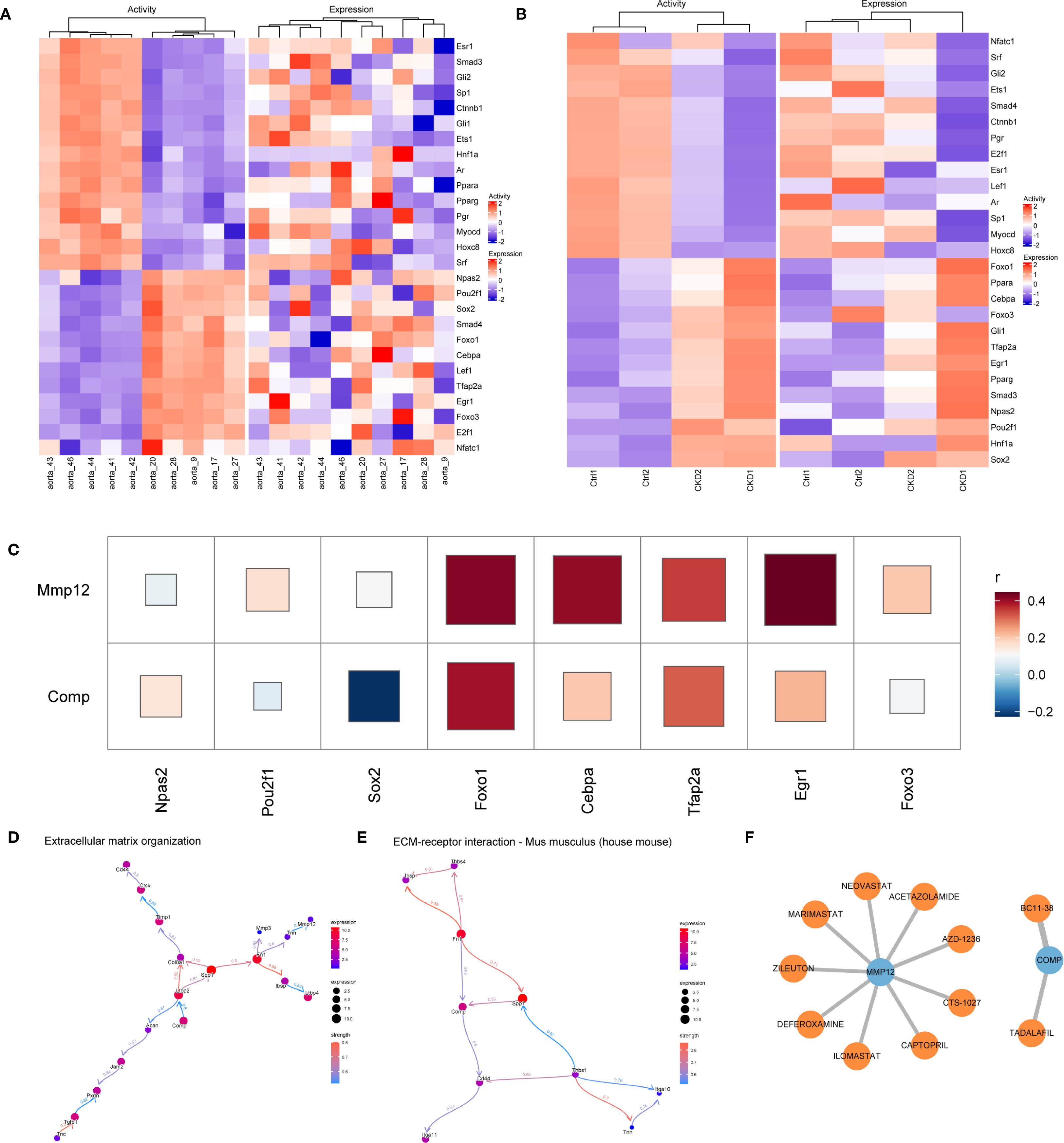 Figure 6. Regulatory networks and clinical relevance in CKD-related vascular calcification. (A, B) NETact-predicted transcription-factor (TF) activity and expression heatmaps in GSE146638 (A) and GSE159832 (B). (C) Correlation heatmap showing positive associations of Foxo1 and Tfap2a with Mmp12 and Comp. (D, E) Bayesian networks (CBNplot) for genes co-expressed with Mmp12 (D) and Comp (E). (F) Drug–gene interaction network (DGIdb, Cytoscape) highlighting Mmp12-targeting MMP inhibitors.