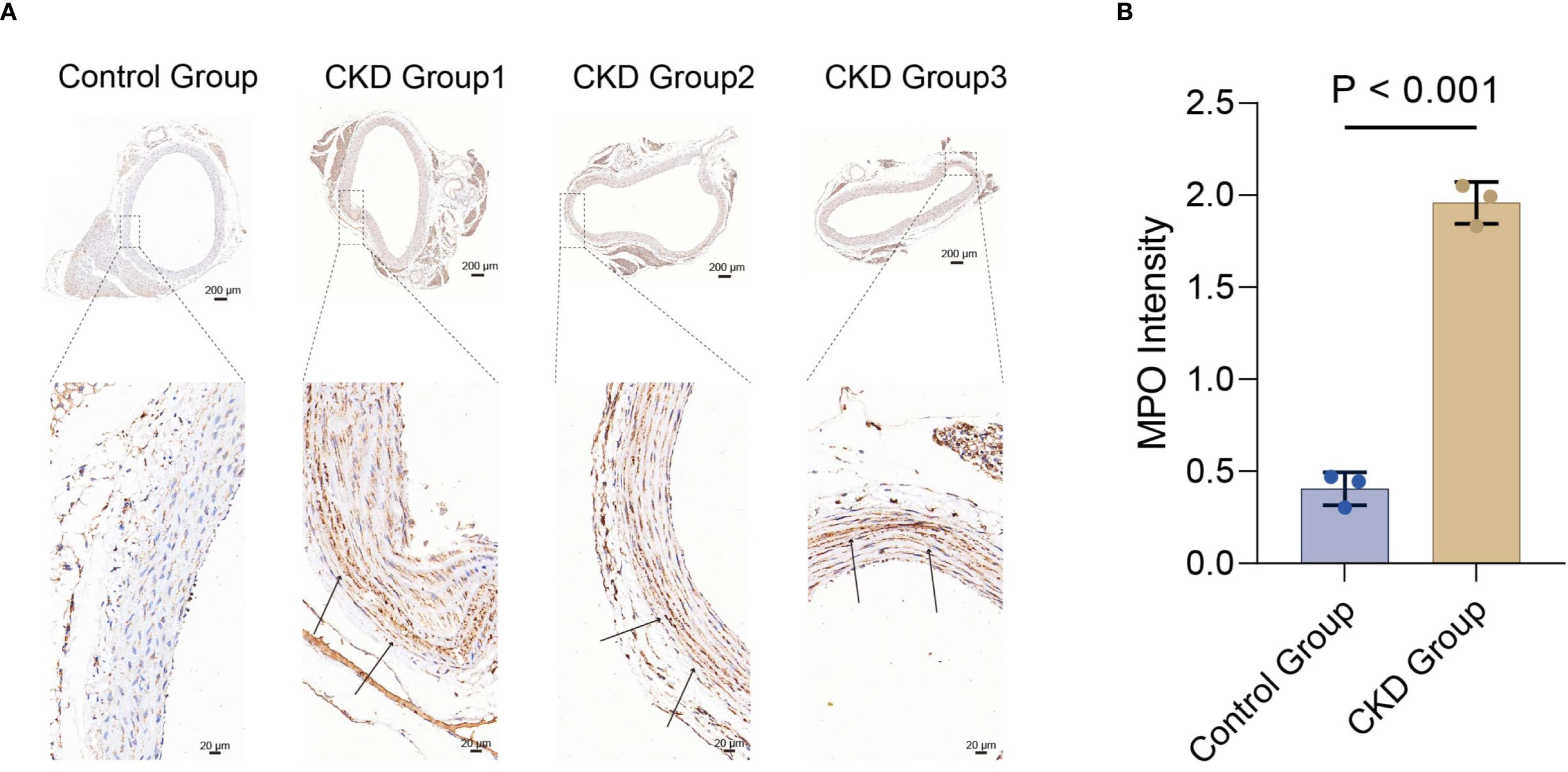 Figure 7. Immunohistochemical detection of MPO in vascular tissue from rat models. (A) Representative whole-section images (scale bar, 200 μm) and magnified views (scale bar, 20 μm) from control and CKD groups. (B) Quantitative analysis of MPO immunostaining intensity; data are presented as mean ± SD (p < 0.001 vs. control), n=3 animals. MPO, myeloperoxidase.