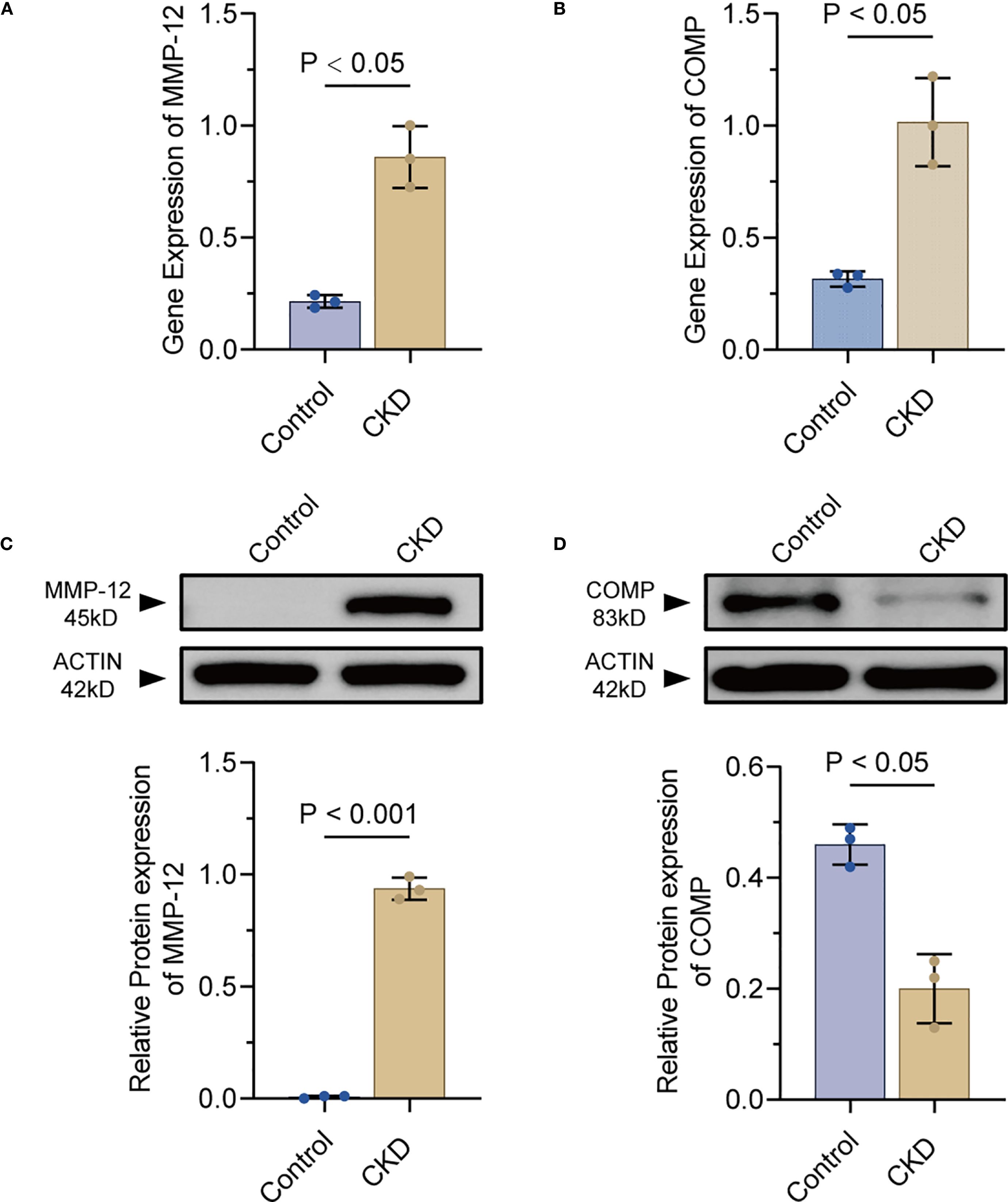 qRT-PCR confirmed statistically distinct expression patterns of Mmp-12 and Comp between the two groups between the CKD group and the control group (p < 0.05)(Figures 8A, B).