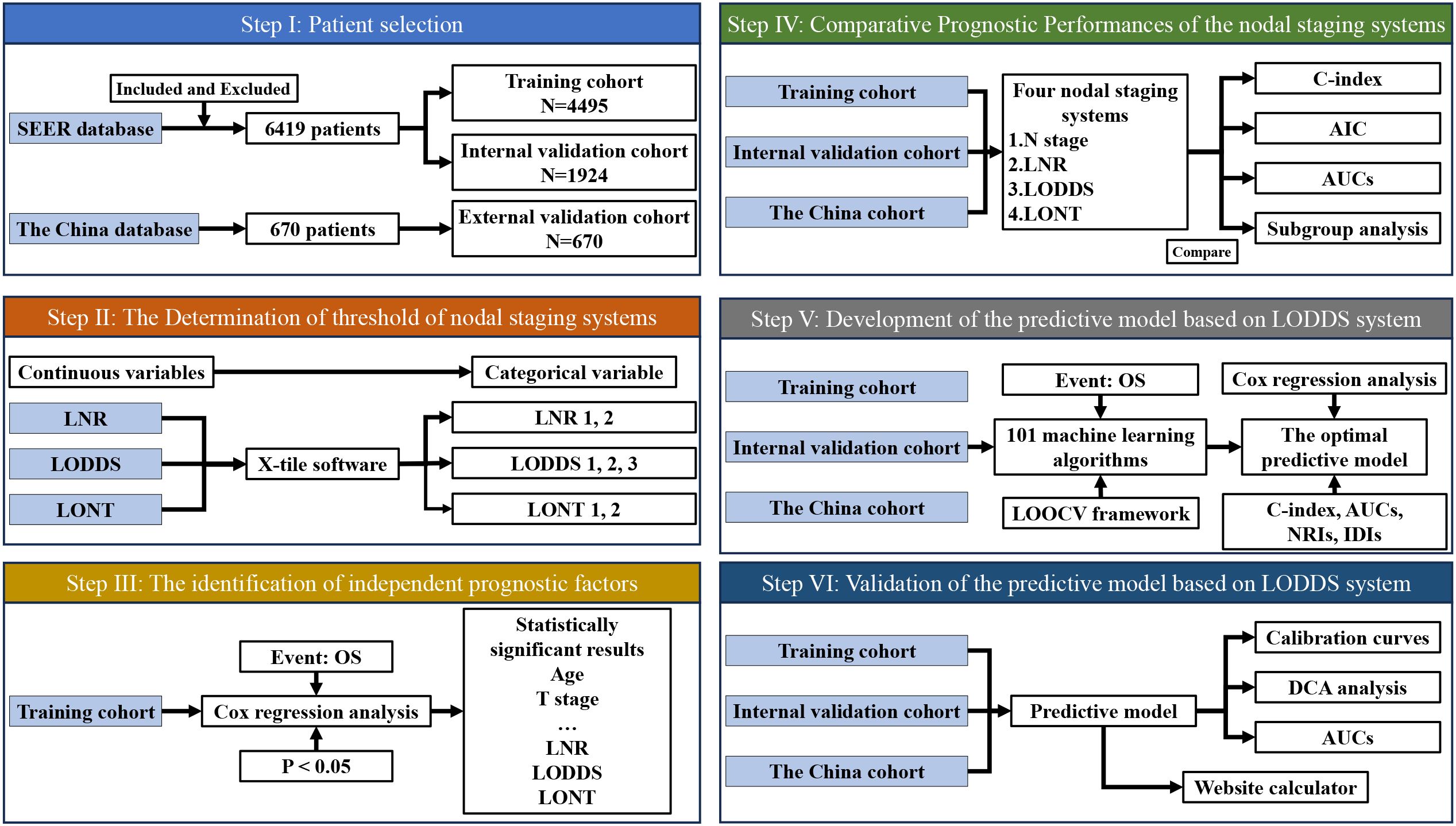 Flowchart depicting six steps in a research process. Step I: Patient selection from SEER database (6419 patients) and China database (670 patients), divided into training, internal, and external validation cohorts. Step II: Determination of threshold of nodal staging systems using X-tile software for variables LNR, LODDS, and LONT. Step III: Identification of independent prognostic factors with Cox regression analysis. Step IV: Comparative prognostic performances tested using four nodal staging systems. Step V: Development of predictive model using machine learning and LODDS system. Step VI: Validation of the predictive model with calibration curves and DCA analysis.