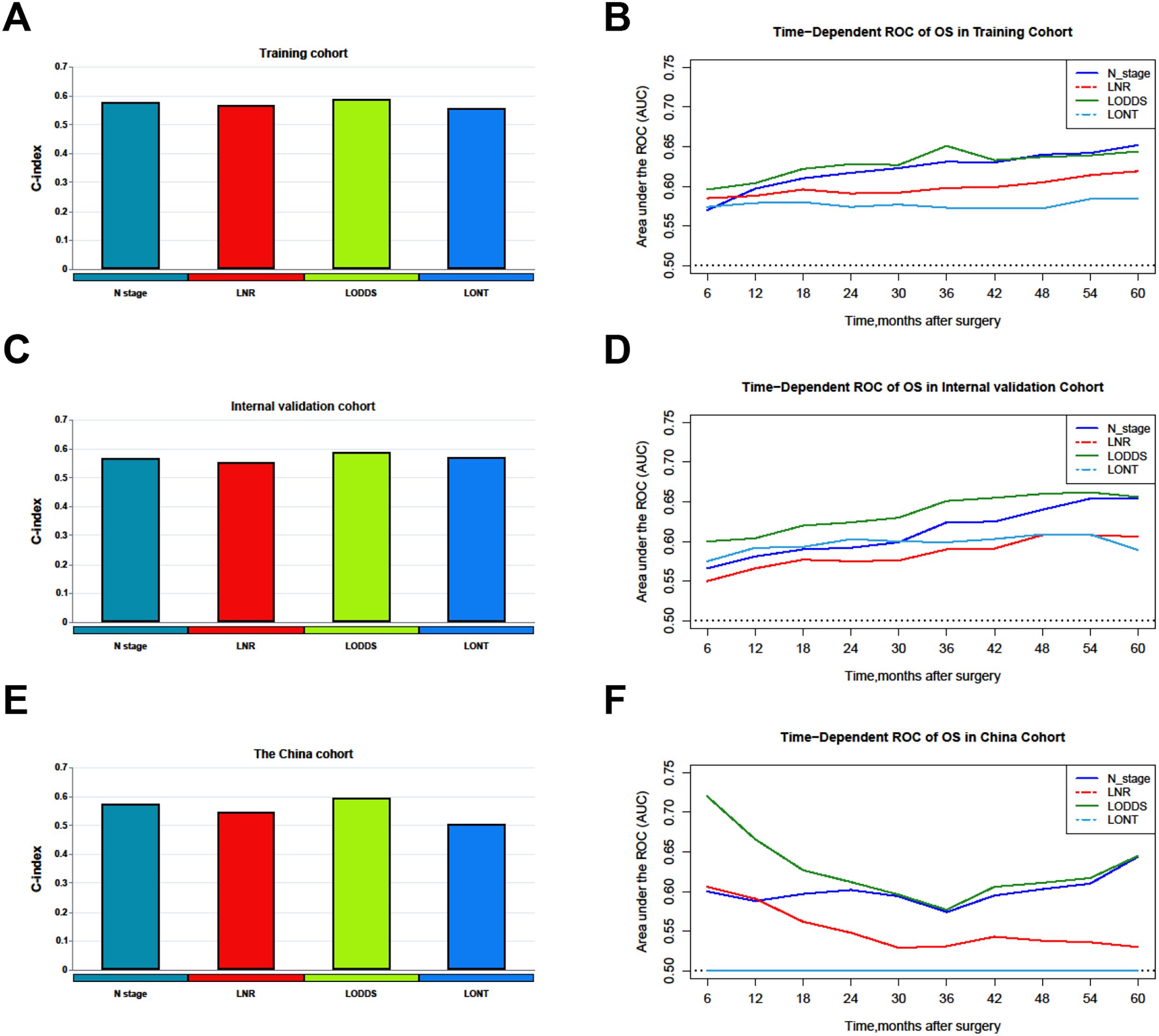 Figure 2. Comparison of the C-index and time-dependent AUCs among nodal staging systems. (A, B) Training cohorts. (C, D) Internal validation cohort. (E, F) The China cohort. LNR, The ratio of metastatic to retrieved nodes; LODDS, The log odds of lymph node ratio; LONT, The log odds of negative lymph nodes/T stage; OS, Overall survival; AUC, Area under the curve.