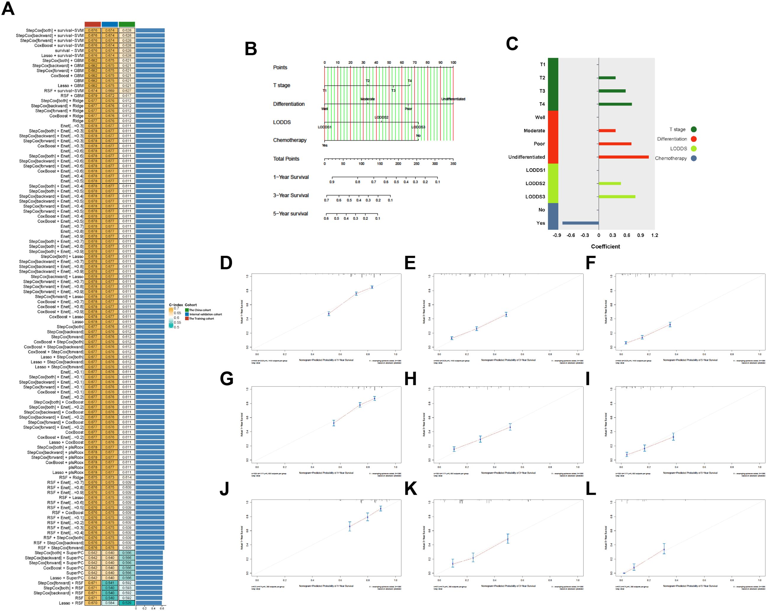 Panel A displays a heatmap with various models and accuracy metrics, color-coded by cohort. Panel B presents a nomogram showing factors like T stage, differentiation, and chemotherapy affecting survival rates. Panel C is a bar chart showing coefficients of these factors. Panels D to L are scatter plots illustrating the predicted versus observed survival probabilities at one, three, and five years, with each plot corresponding to different sets or methodologies.