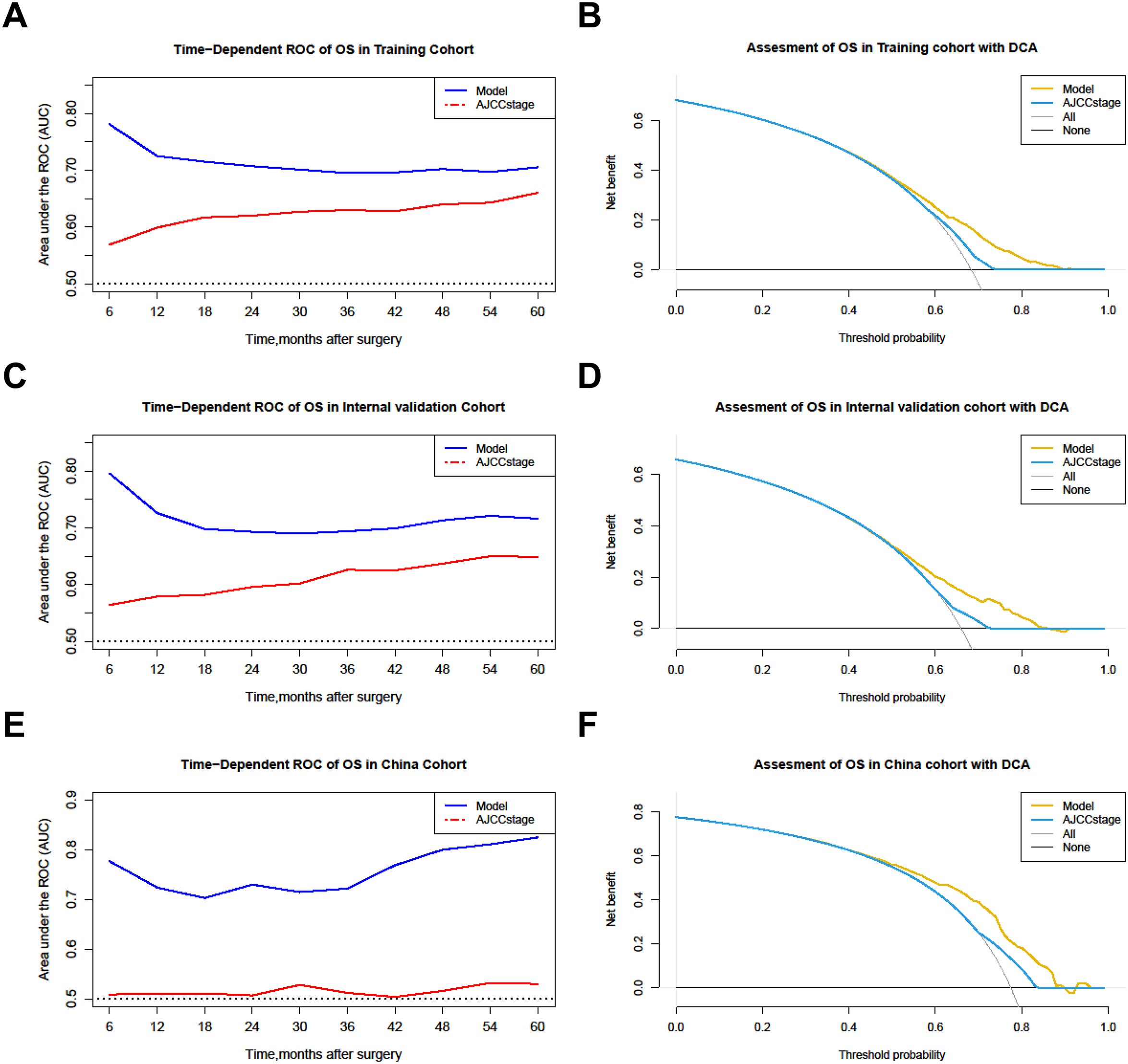 Figure 4. Comparison of the time-dependent AUCs and DCA between the model and the AJCC staging system. (A, B) Training cohorts. (C, D) Internal validation cohort. (E, F) The China cohort. OS, Overall survival; ROC, Receiver operating characteristic; DCA, Decision curve analysis.