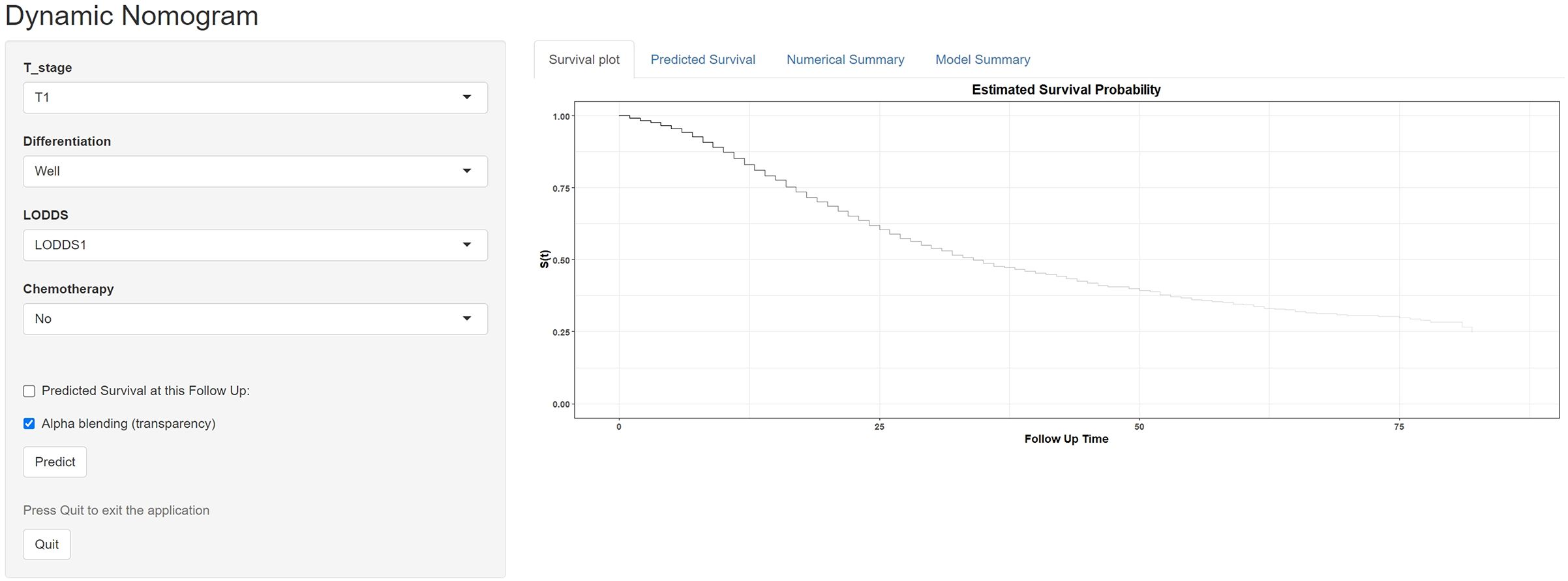 To facilitate the application of our machine learning-based nomogram more conveniently, we developed and established a website calculator (https://vs-prediction.shinyapps.io/OS-PHC-prediction-tool/, Figure 5). Clinical physicians can calculate the corresponding survival probabilities by entering the demographics and characteristics of patients with PHC.