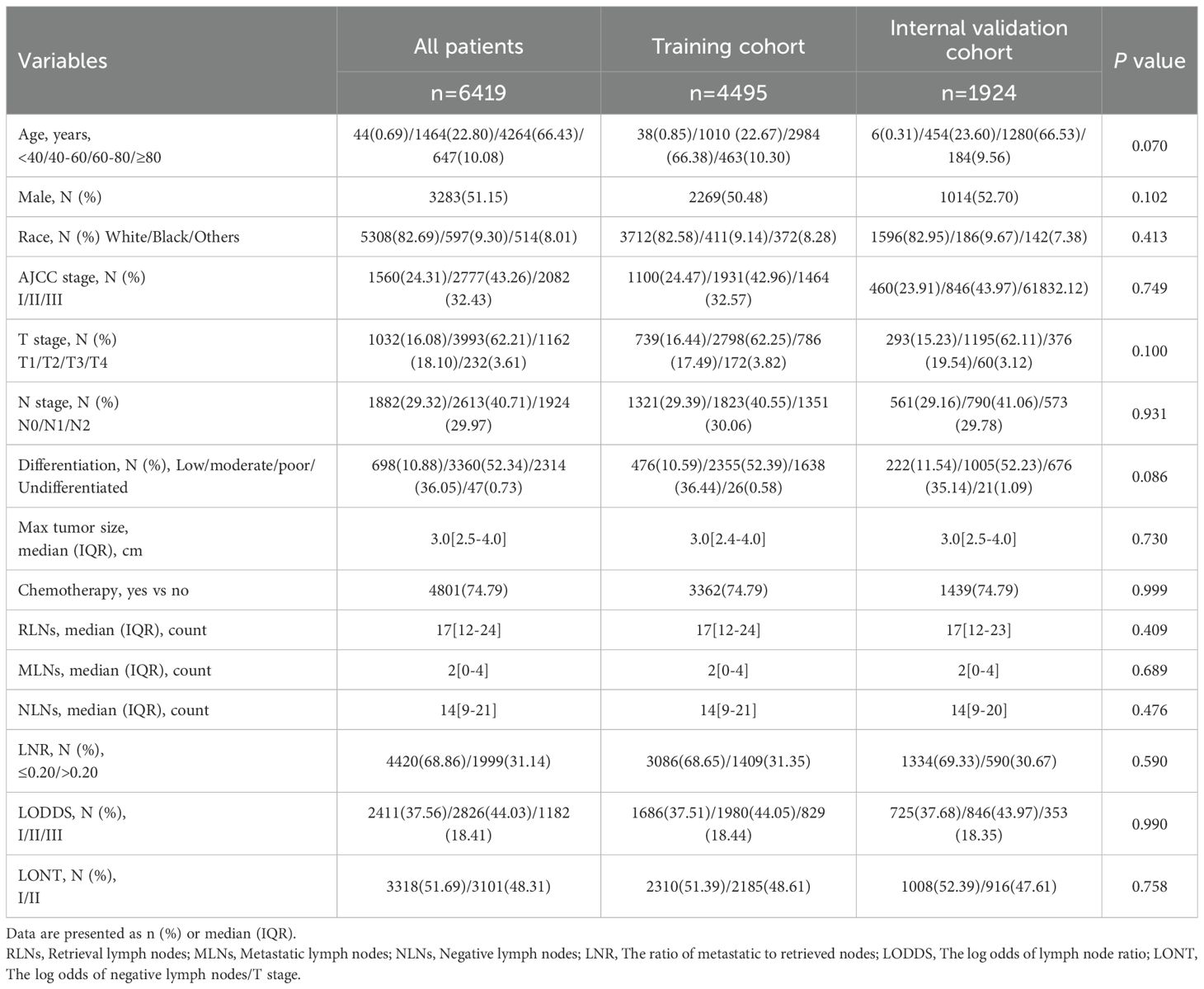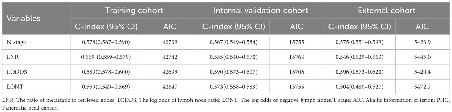 Then, the SEER cohort were randomly divided into the training and internal validation cohort at a ratio of 7:3 using “caret” package in R software (version 4.3.3). The training cohort was used to evaluate performance of different nodal staging systems predicting OS, and the performance was verified and generalized in the internal and external validation cohort.