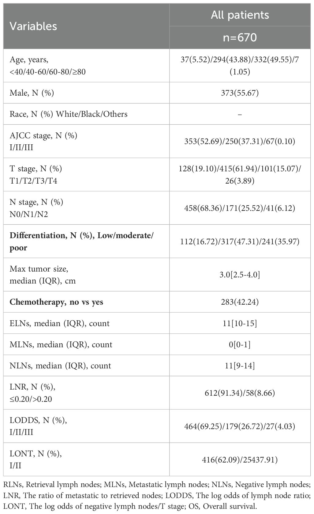 In the present study, the LNR ranged from 0 to 1, the LODDS ranged from -2.16 to 1.81, and the LONT ranged from 0 to 1.83 (Supplementary Figure 1). Based on the threshold, LNR was grouped into LNR1 (LNR ≤ 0.20) and LNR2 (LNR > 0.20), LODDS was classified into LODDS1 (-2.16 ≤ LODDS < -1.01), LODDS2 (-1.01 < LODDS ≤ -0.29), and LODDS3 (LODDS > -0.29), LONT was divided into LONT1 (LONT < 0.58) and LONT2 (LONT ≥ 0.58).