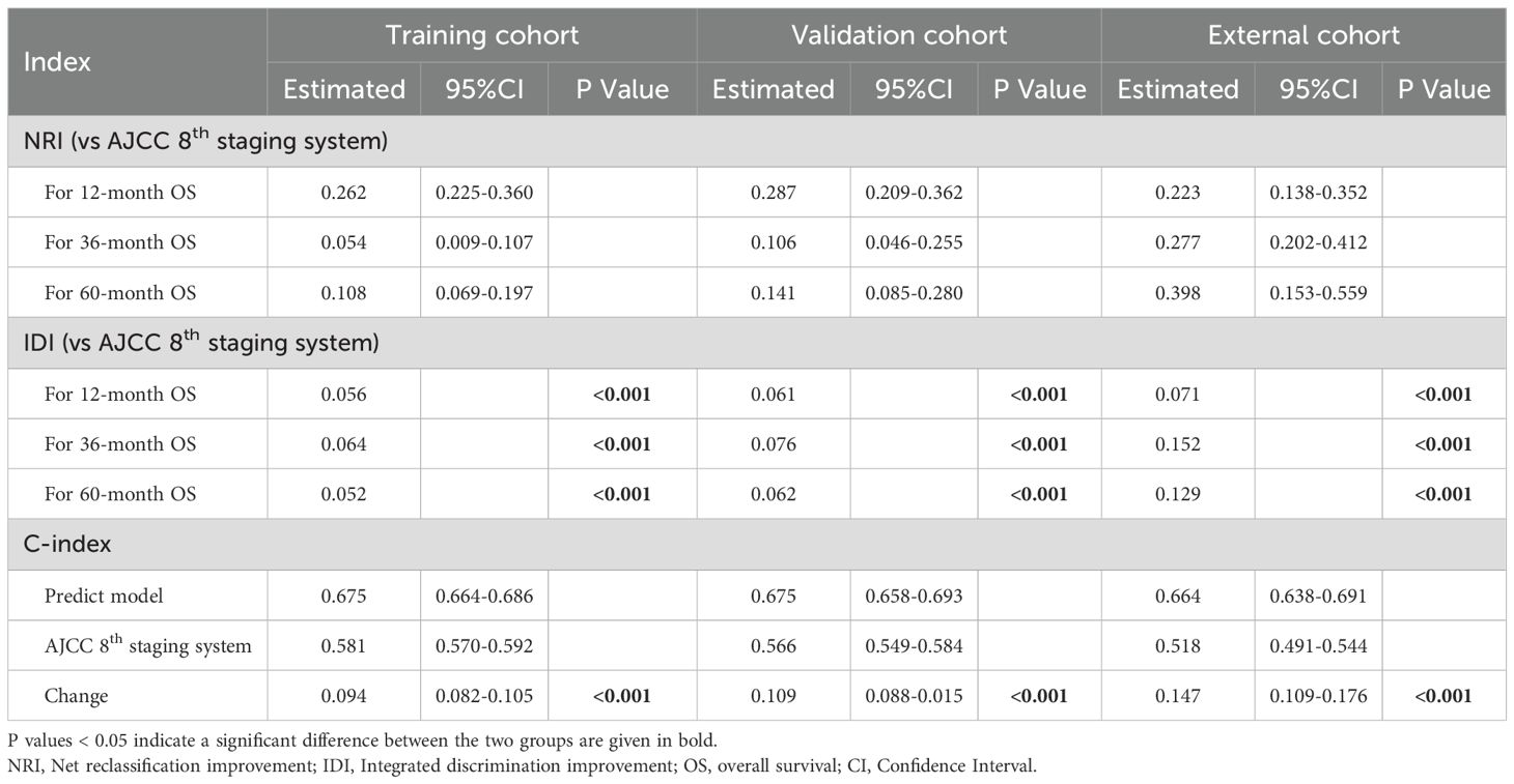 Table 5. The NRIs, IDIs, and C-index of the predictive model and AJCC 8th staging system in overall survival prediction.