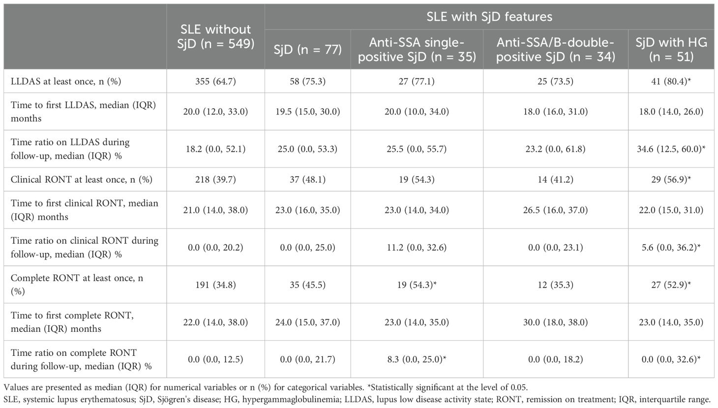 Definition of Remission In SLE (DORIS) was used to define remission, including clinical SLEDAI = 0 with PGA < 0.5, of which RONT allowed prednisone 5 mg/d at most and maintenance immunosuppressants. Complete RONT further requires normal serology (anti-dsDNA and complements) (8). LLDAS was defined as SLEDAI ≤ 4, with no activity score in cardiopulmonary, renal, central nervous system, vasculitis, or gastrointestinal involvement or hemolytic anemia; no new features compared with the last visit; PGA ≤ 1; prednisone dose ≤ 7.5 mg/d; and well-tolerated maintenance doses of immunosuppressants (14). The status of clinical/complete RONT, LLDAS, and their components was evaluated at each visit. To describe the overall condition, the following were calculated: the proportion of patients reaching the target range at least once, the accumulated time spent within the target range, and the time to first achievement of the target. These metrics were stratified by SjD immunological characteristics of interest.