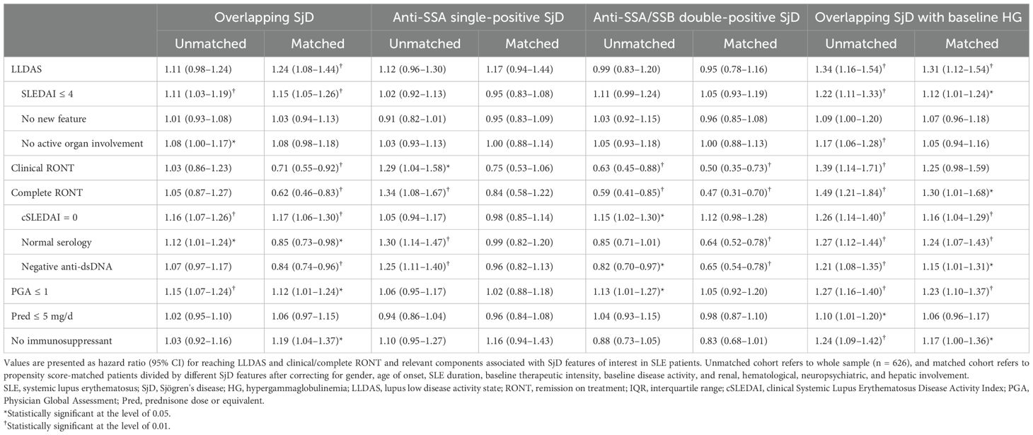 Methods: The medical records of patients in the Peking University First Hospital SLE (PKUFHS) cohort from 2007 to 2019 were retrospectively reviewed. Demographics, SLE and SjD features, treatment, and whether in LLDAS/remission on treatment (RONT) or not at each visit were collected. According to overlapped SjD and its immunological features, all patients were categorized into the following subgroups: SjD with anti-SSA single positivity, SjD with anti-SSA/SSB double positivity, SjD with baseline hypergammaglobulinemia, and those without SjD. The Cox proportional hazards model in propensity score-matched cohorts was used to estimate the impact of different SjD characteristics on LLDAS/RONT and each component after correcting for known confounders.