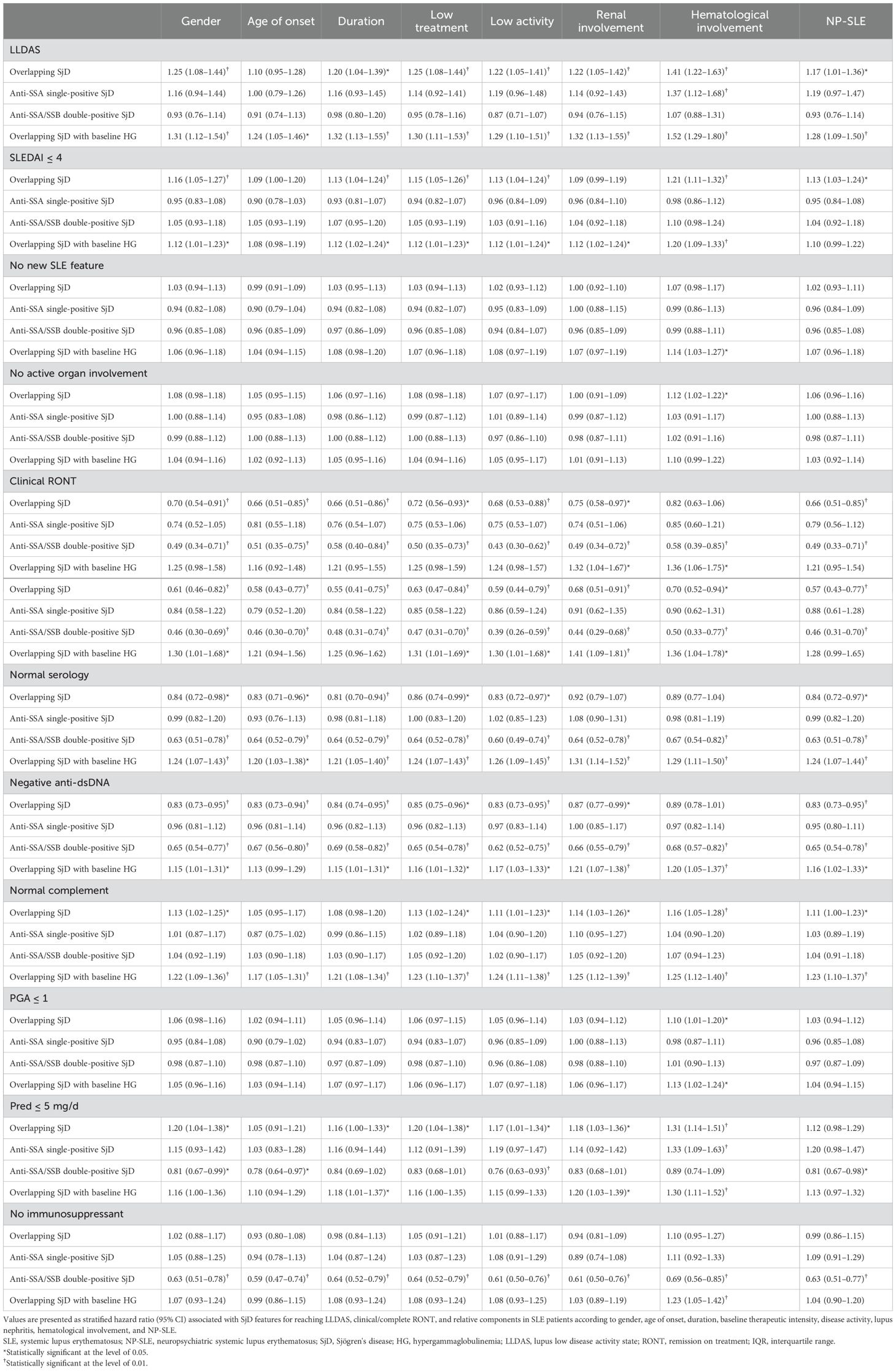 Table 3. Hazard ratios for probability of reaching remission or low disease activity associated with overlapping SjD or its features stratified by critical confounding factors in SLE patients.