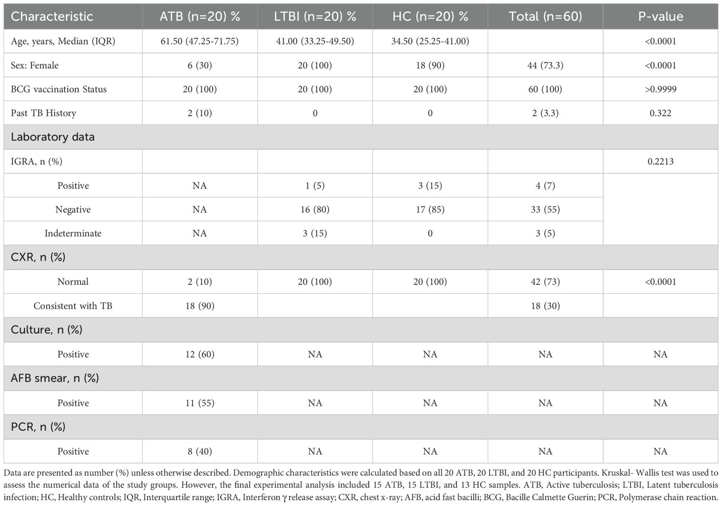 A total of 60 subjects (20 ATB patients, 20 LTBI individuals, and 20 HC) were enrolled into the study. The final cohort for immunological analyses comprised 15 ATB, 15 LTBI, and 13 HC after exclusions for low PBMC yield. The clinical and demographic characteristics of the enrolled participants according to their initial group allocation are summarized in Table 1. None of the ATB patients or LTBI individuals were receiving anti-TB treatment at the time of sampling. The median (IQR) age of the volunteers in the ATB, LTBI, and HC groups was 61.5 ± 24.5 years, 41 ± 16.25 years, and 34.5 ± 15.75 years, respectively. Most of the participants were female (73.3%). All participants were previously BCG vaccinated.