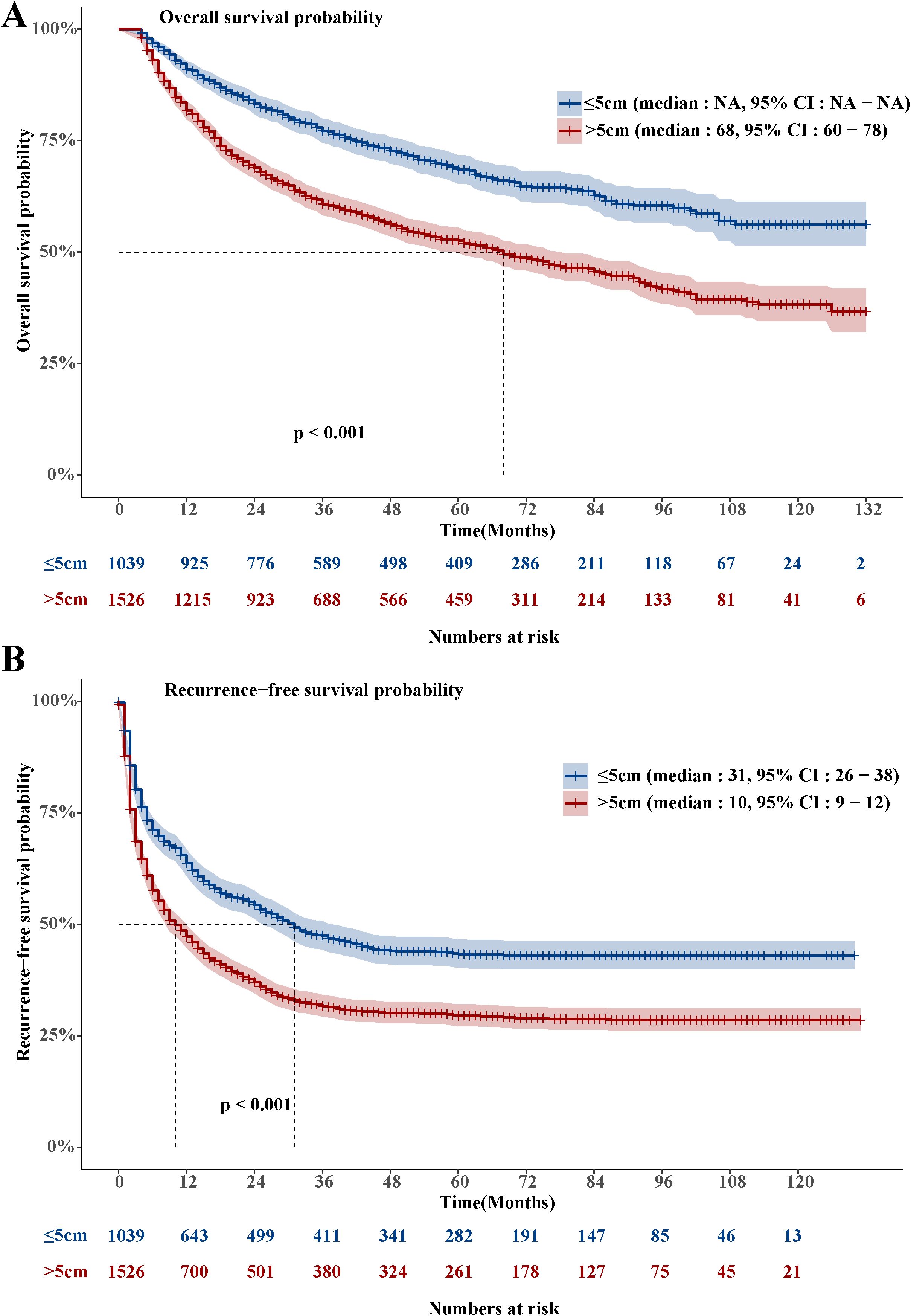 The LHCC group’s OS was much shorter than that of the SHCC group. (Hazard Ratio, HR: 1.81, 95% Confidence Interval, CI: 1.585-2.068, Figure 1A). A total of 1,017 people died in the LHCC group, resulting in an overall mortality rate of 66.6%. In the LHCC group, the survival rates were 81.5% at the 1-year mark, 60.5% at the 3-year mark, and 52.2% at the 5-year mark. Similarly, the RFS of the LHCC group was significantly shorter compared to the SHCC group (HR: 1.526, 95% CI: 1.376-1.693, Figure 1B). A total of 1,035 people experienced recurrence in the LHCC group, leading to an overall recurrence rate of 67.8%. Among the patients in the LHCC group, the rates of RFS were 47.6% after 1 year, 32.3% after 3 years, and 30.0% after 5 years.