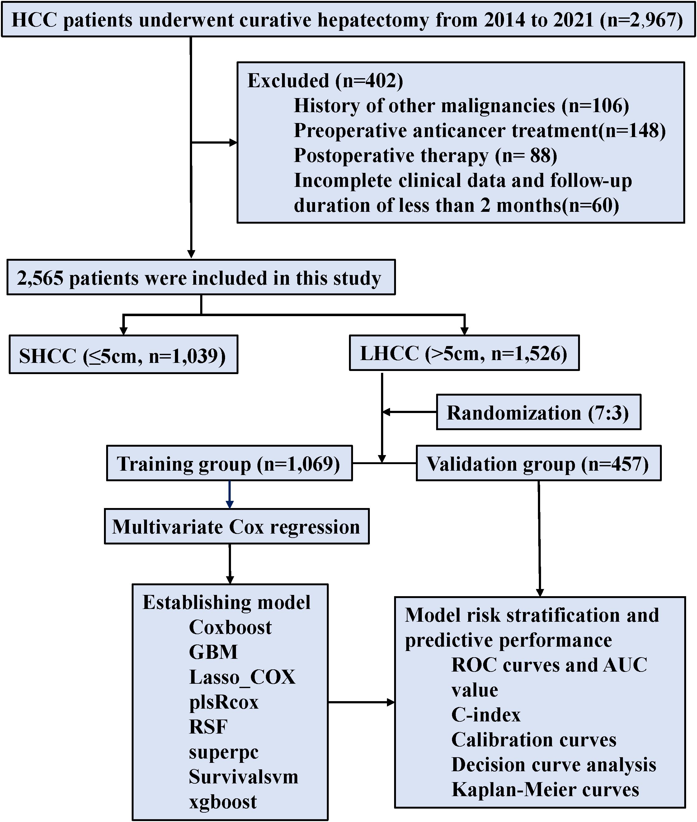 Methods: This study included 2,565 patients with hepatocellular carcinoma (HCC) who underwent curative hepatectomy between January 2014 and December 2021. The LHCC patients were randomly assigned (7:3 ratio) to a training (n=1069) or validation (n=457) group. Independent risk factors for OS were identified using multivariable Cox regression. Eight ML models were developed and compared. The optimal model’s interpretability was assessed using Shapley Additive Explanations (SHAP).