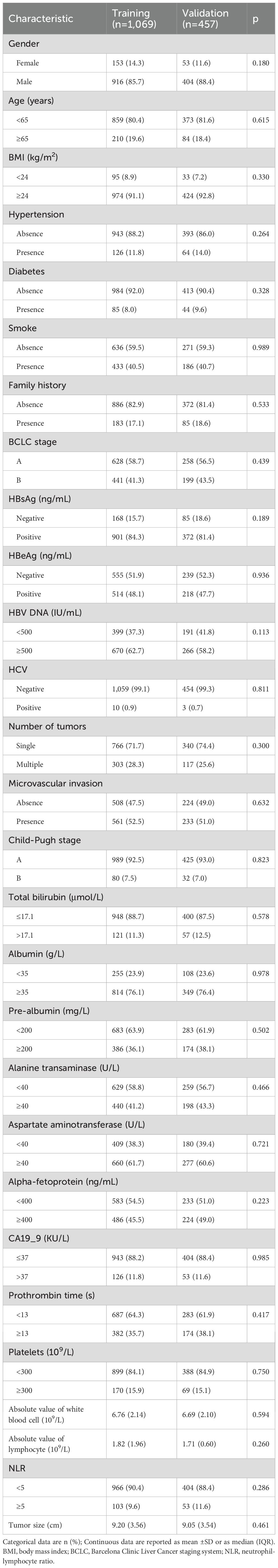 Between 2014 and 2021, 2,565 HCC patients were enrolled, including 1,526 patients with LHCC and 1,039 patients with SHCC. For additional analysis, LHCC patients were randomly split into the training group (n = 1,069) and the validation group (n = 457) in a 7:3 ratio (Figure 2). The baseline characteristics for both groups were presented (Table 1). Notably, 41.3% of patients in the training group were classified as BCLC stage B, whereas 43.5% of the validation group fell into the same category. MVI was present in 52.5% of the training group and 51.0% of the validation group. In the training group, the average tumor size was 9.20 cm, while in the validation group, it was 9.05 cm. No statistically significant differences were observed between the two groups (p>0.05). The median OS follow-up times were 42.2 months for the training and 41.5 months for the validation group.