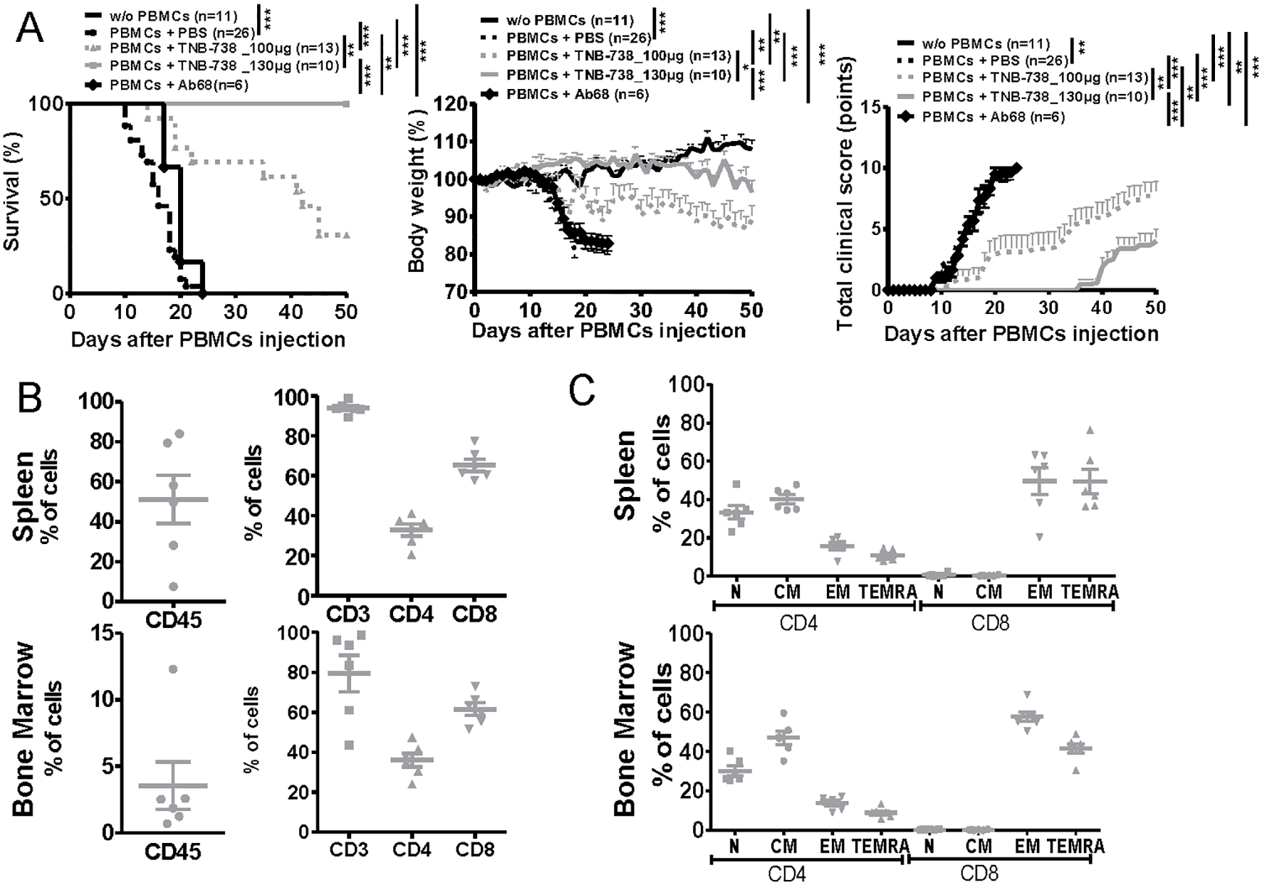 TNB-738 prevents Xeno-GvHD in humanized NSG mice with long-term survival of human T cells at day 50. (A) NSG mice were irradiated (1.5 Gy) and 24h later received hPBMC i.v (day 0) or not (black line). Animals were then treated with i.p injections of PBS (dotted black line); TNB-738 at 100µg (dotted gray line) or 130µg (gray line), anti-mouse CD38 Ab68 as a control at 100µg (black line with lozenge) from day 0 to day 18 twice a week. Mice were sacrificed when they lost 20% of initial body weight (IBW). Left graph represents survival curve, Middle graph shows mean of body weight in each group as a percentage of IBW, right graph shows total clinical score as a mean for each group. (data from 3 independent experiments). (B) Percentage of CD45+ cells (left graph) or CD3+, CD4+ and CD8+ cells (right graph) in spleen (upper graph) or bone marrow (lower graph) in mice treated with TNB-738 130µg at day 50. (C) Percentage of Naïve hCCR7+CD45RA+ (N), Central Memory hCCR7+CD45RA- cells (CM), Terminal effector memory CD45RA+ cells hCCR7-CD45RA+ (TEMRA) and Effector Memory hCCR7-CD45RA- (EM) on hCD4+ and hCD8+ from spleen (upper graph) or bone marrow (lower graph), *p<0.05 **p<0.01 ***p< 0.001.