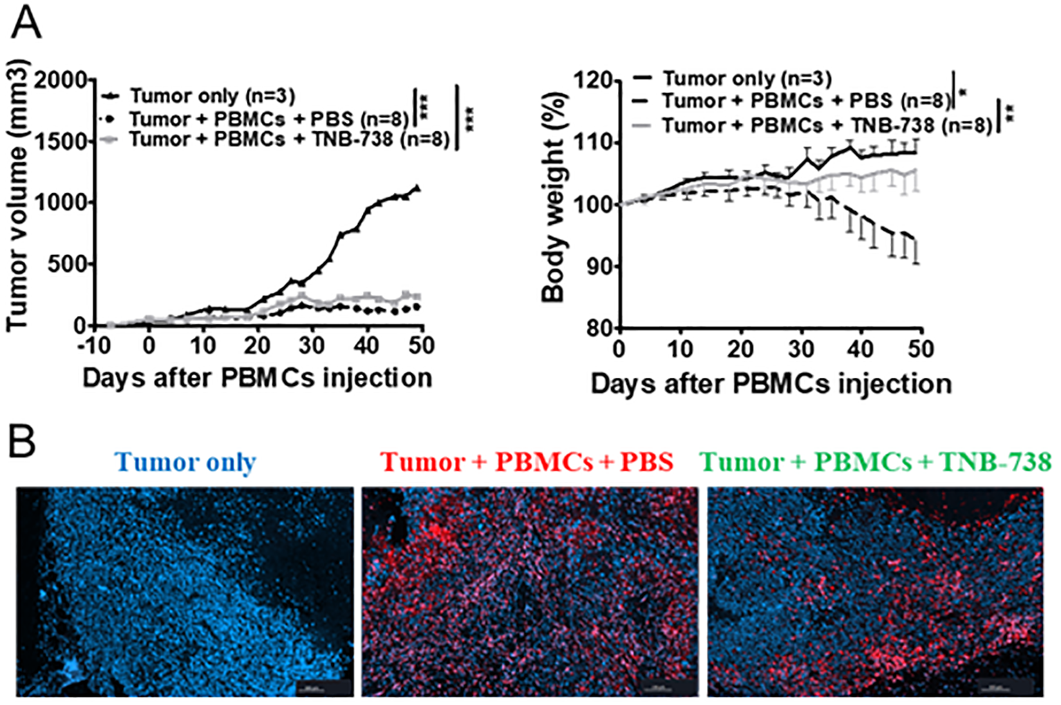Two-way repeated measure ANOVA was used to analyze mouse weight loss, clinical score, and tumor volume. Log Rank (Mantel Cox) test was used to analyze survival. Unpaired t test was used to compare cell immunophenotyping between two groups: untreated and treated (TNB-738).