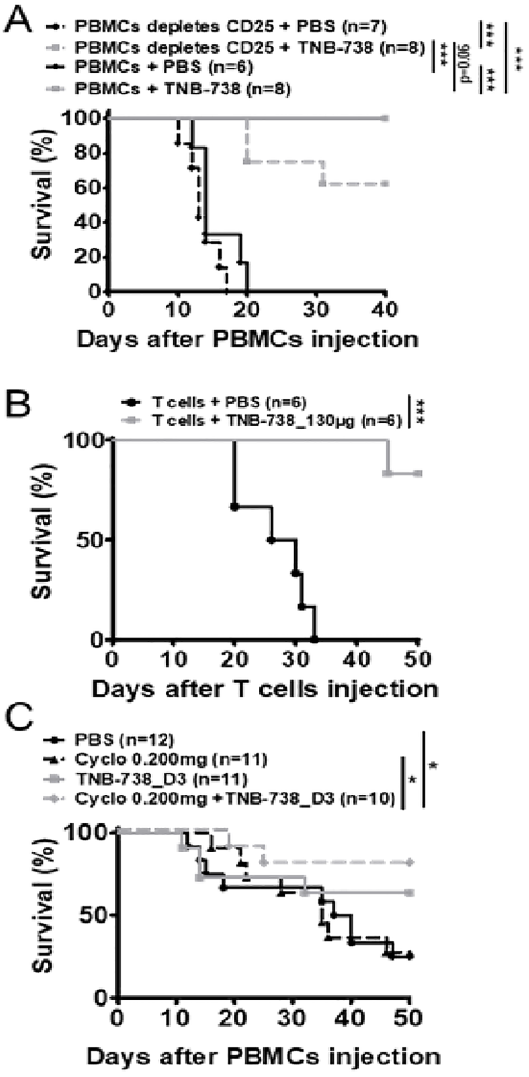 As we observed a relative increase of Treg cells in TNB-738 treated animals, we evaluated whether Treg cells were essential for the effectiveness of TNB-738. To answer this hypothesis, immunodeficient NSG mice were injected with human PBMCs depleted of CD25 bright cells (Figure 5A, Supplementary Figure 2A). We observed significant differences between survival of mice treated with TNB-738 (gray curves) and injected with hPBMC depleted of CD25+ cells compared to PBS treated mice (black curve). At D40, GvHD occurred in 38% of mice that received hPBMC depleted of hCD25+ cells plus TNB-738 compared to no GvHD in mice that received total hPBMC cells plus TNB-738 (data not shown). However, survival in these two groups did not reach statistical significance (p=0.06).