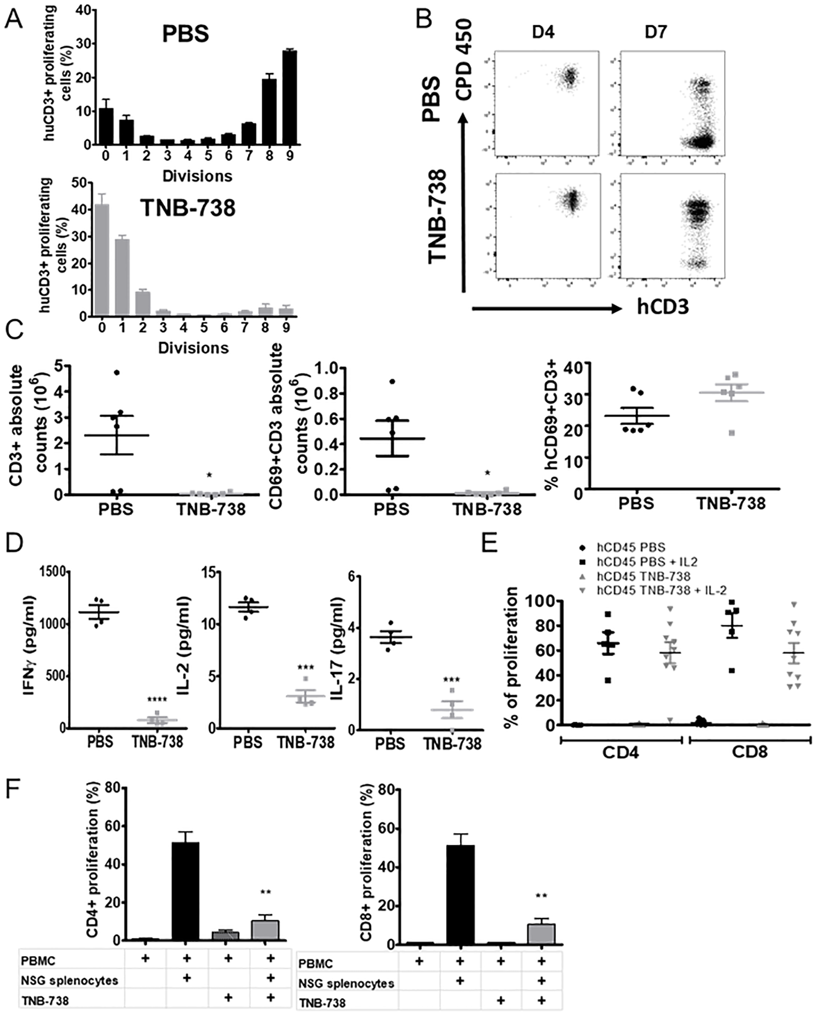 hPBMC were stained with CPD eFluor 450 (eBiosciences) according to the manufacturer’s instructions. Fluorescent dye-labelled PBMCs were adoptively transferred into the lateral tail vein of host irradiated NSG mice (20.106 in 200 µl of PBS with insulin syringe). Mice were treated with TNB-738 (130 µg per mouse) twice a week starting on the day of injection of PBMCs (D0). After 4, 7 days, spleens of humanized mice were harvested, and splenocytes were isolated (see above, “Analysis of immune cells in spleen and bone marrow”) for staining and analysis by flow cytometry. Sera were collected for cytokine analysis.