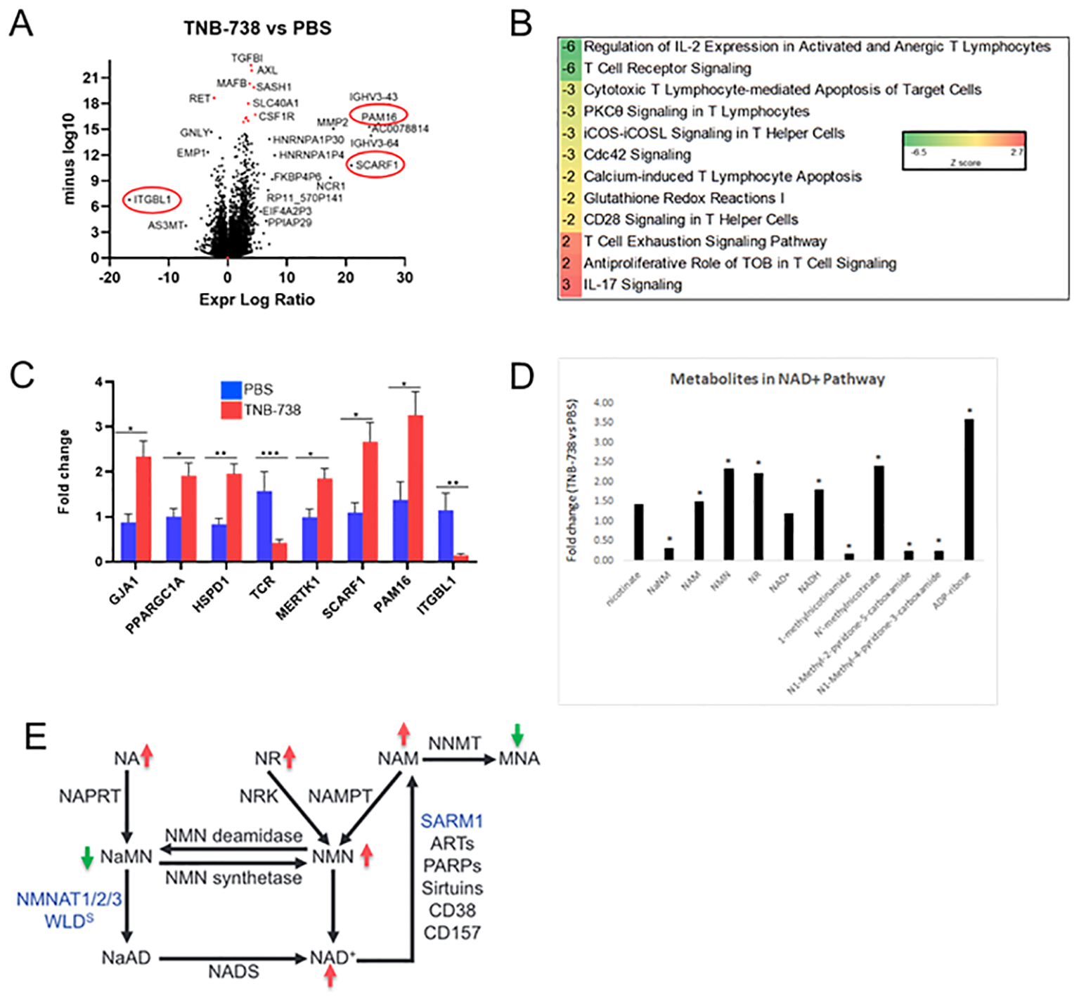 In conclusion, inhibition of the enzyme functions of CD38 on immune cells in vitro and in vivo increases intracellular NAD+ levels and activities of NAD-dependent enzymes. This change in NAD metabolism has strong anti-inflammatory effects in an animal model of xeno-GvHD. Human T cells survived long-term in treated NSG mice engrafted with human PBMC. In addition, engrafted T cells were functional indicated by the fact that T cells responded to Il-2 ex vivo and rejected implanted tumor cells in vivo. Transcriptome and metabolome analysis of human T cells and tissues of TNB-738 treated mice revealed upregulation of anti-T cell proliferative mechanisms and shifts to more favorable energy balances in tissues. In conclusion, TNB-738 has an attractive therapeutic profile for the treatment of inflammatory diseases, including GvHD.