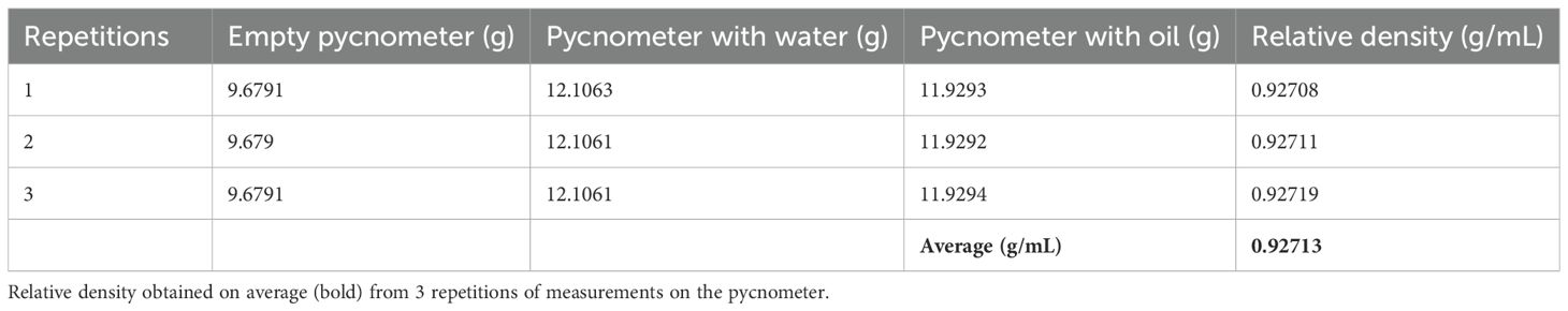 The density of the oil was measured using a pycnometer and an analytical balance, as mentioned in Materials and Methods (see Tables 1, 2).