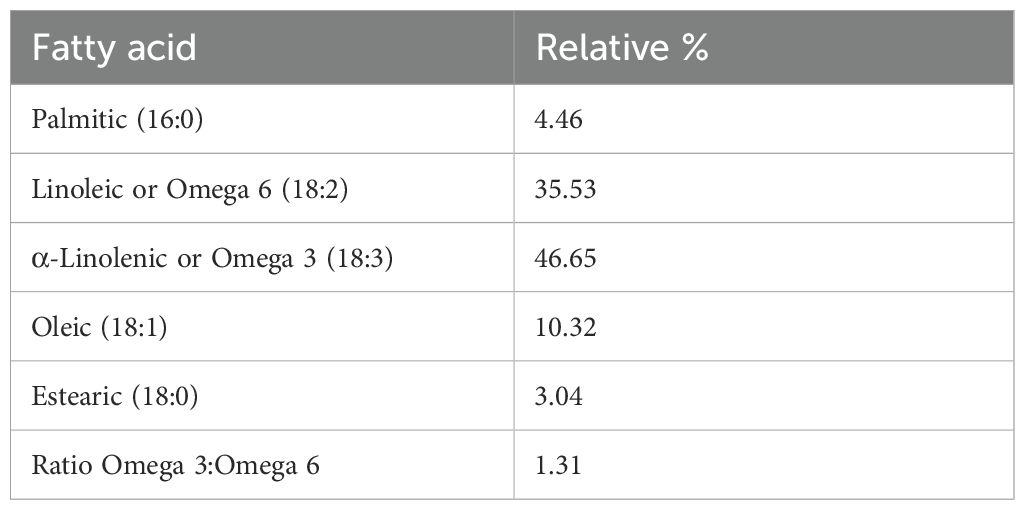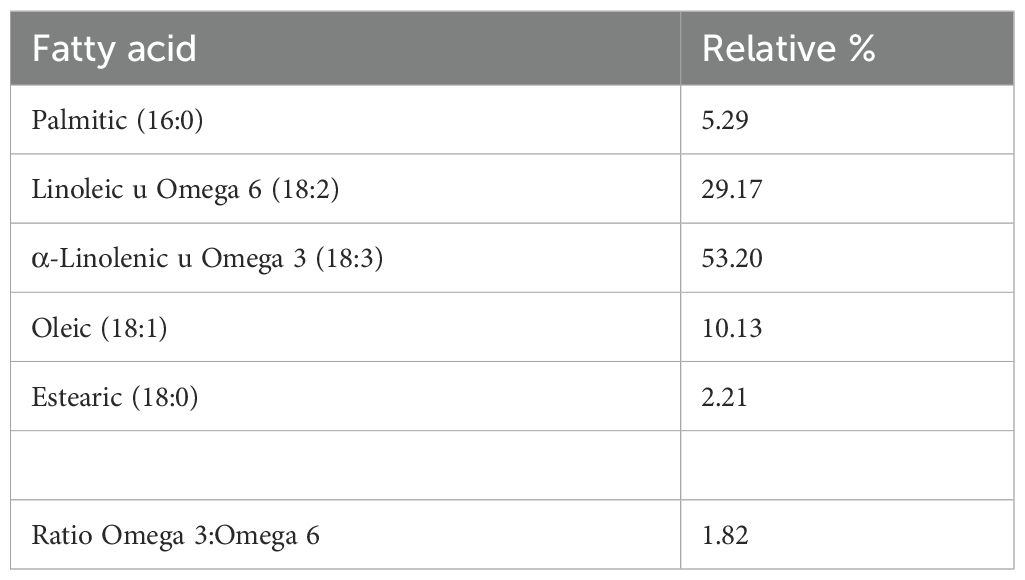 These seeds have a high protein (33%) and oil (49%) (2) content, as well as other nutrients. It contains α-linolenic omega 3 (ALA ω-3) fatty acids between 45% and 54%, linoleic omega 6 acid (LA ω-6) at 36%, and oleic omega 9 acid (OA w-9) at 9% (2, 3). As a comparison, fish oil contains between 0.1% and 5.2% of ALA ω-3, but 10% to 20% eicosapentaenoico (EPA ω-3), 8% to 15% docosahexaenoic acid (DHA ω-3), 1% to 4% of ω-6, and 10% to 25% of ω-9 (4).