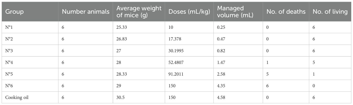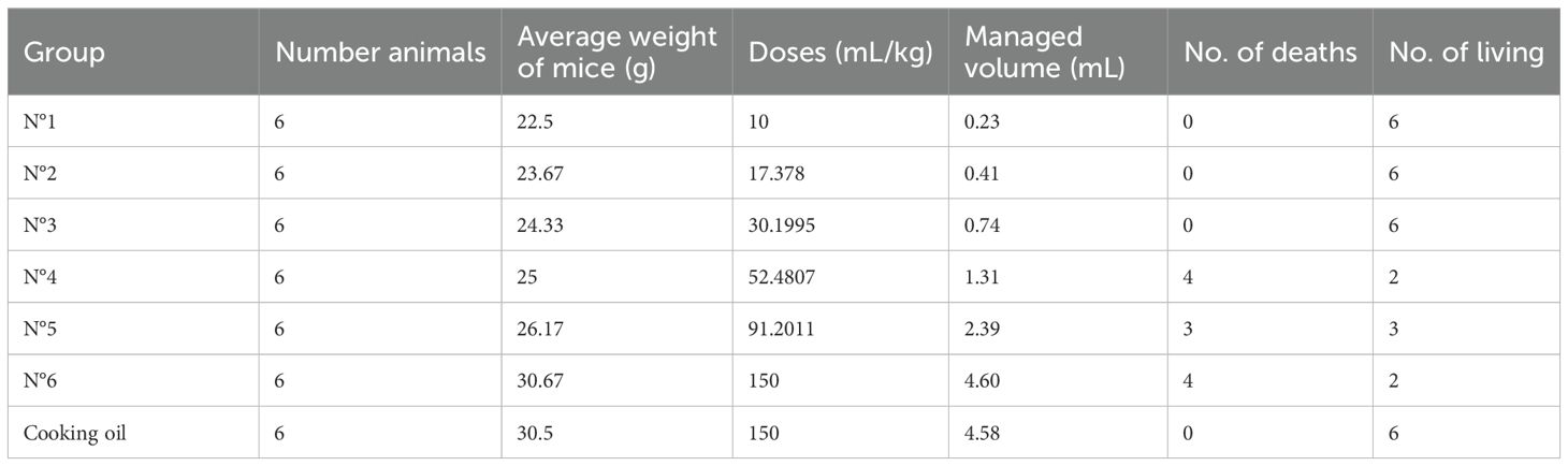 Six groups of six mice each were formed. Prior to the administration of the products, the animals had a 24-h period of fasting and adaptation. The first group was administered 10 mL/kg, the second 17.4 mL/kg, the third 30.2 mL/kg, the fourth 52.5 mL/kg, the fifth 91.2 mL/kg, and the sixth 150 mL/kg of each of the oils or as control group; vegetable cooking oil (CIL brand, batch: 1623L) was administered.