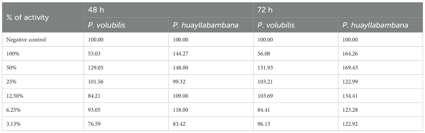 ● For P. huayllabambana, an IC50 for 48 h of 50,695 mg/mL, while 67,179 mg/mL for 72 h.