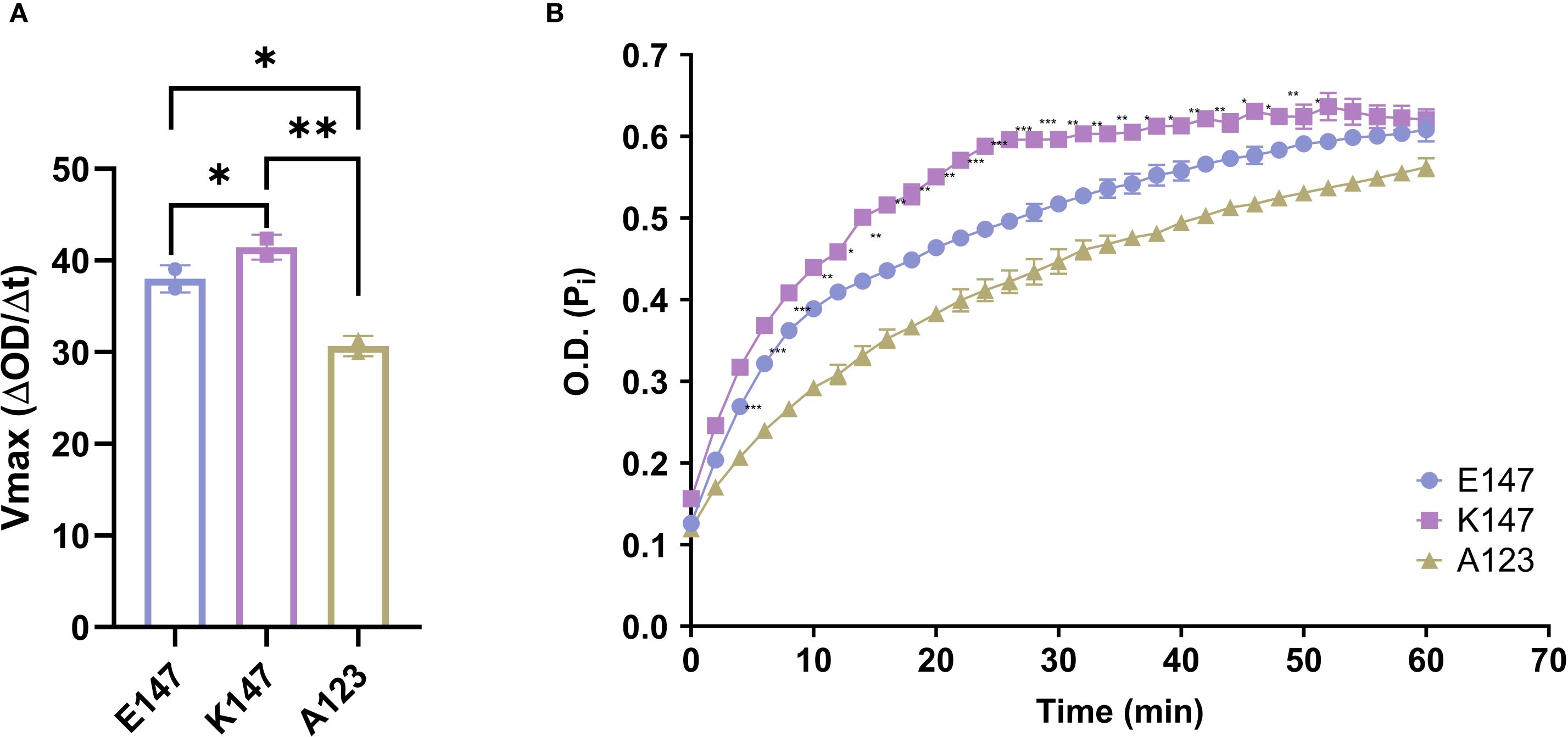 Figure 1. E147K substitution promotes TAGAP activity. (A) Vmax of E147, K147, and A123 TAGAP variants facilitated RhoA-dependent GTP hydrolysis reactions (n = 2; **P < 0.01, *P < 0.05 using one-way ANOVA test followed by the post-hoc Sidak multiple comparisons test). (B) Time course of inorganic phosphate production from TAGAP variants facilitated GTP hydrolysis reactions (n = 2; ***P < 0.001, **P < 0.01, *P < 0.05 using one-way ANOVA test followed by the post-hoc Sidak multiple comparisons test between E147 vs. K147). Each dot represents an individual reaction. All data are presented as mean ± SD.