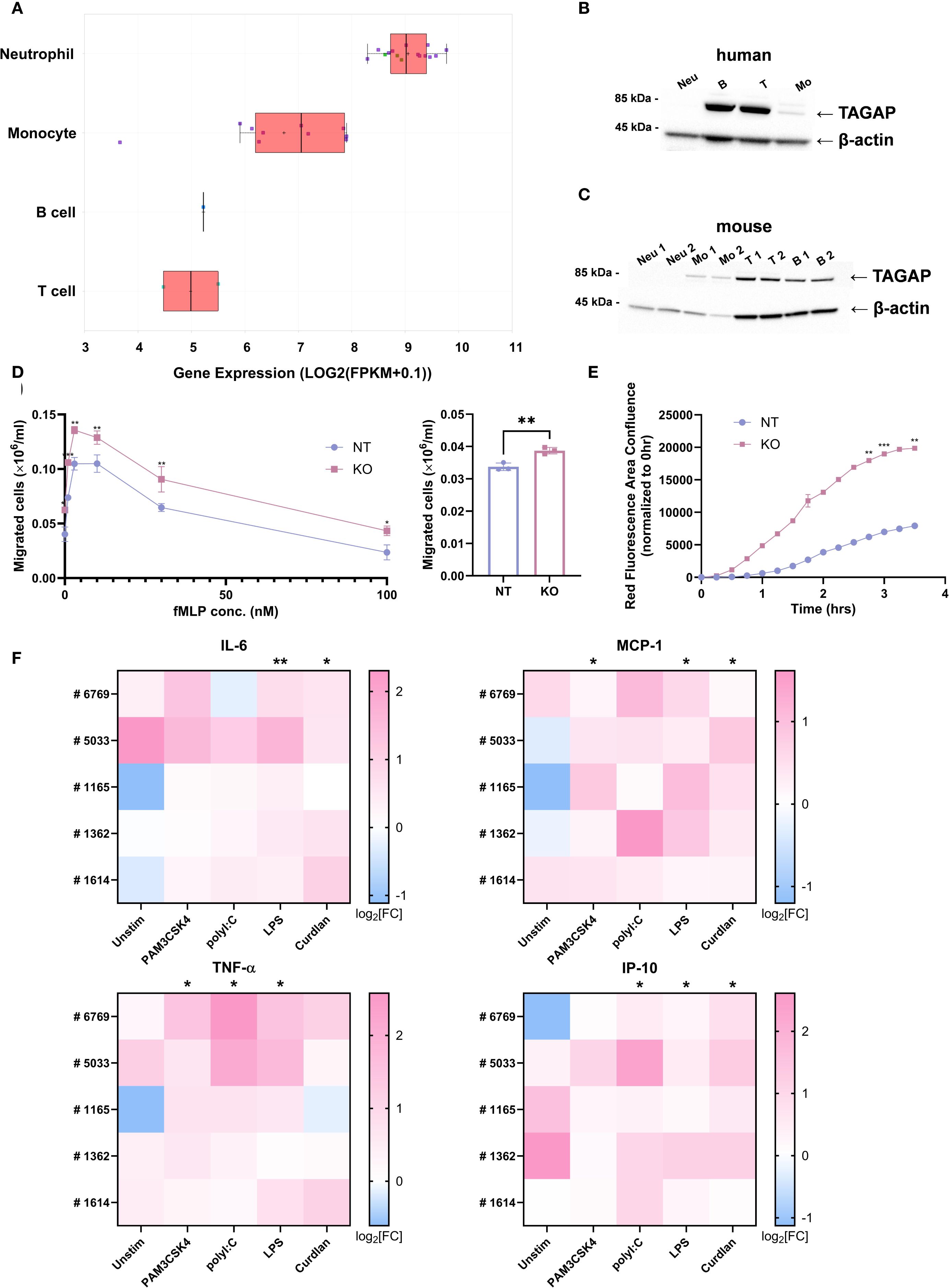 Figure 2. TAGAP is expressed in myeloid cells and plays a suppressive role in myeloid cell migration, phagocytosis, and cytokine secretion. (A) Box plot comparing TAGAP expression in different human primary immune cells in QIAGEN Omicsoft Body Map release Blueprint_B37. (B) Western blotting of TAGAP from different human blood immune cells. (C) Western blotting of TAGAP from murine bone-marrow-derived neutrophils and monocytes as well as splenic T cells and B cells. (D) The migrated non-targeting (NT) control and TAGAP KO HL-60 cells in response to fMLP gradient (left) and 10 nM LTB4 (right) after 60-min incubation in transwell systems (n = 3; **P < 0.01, *P < 0.05 using Student’s t-test). (E) Kinetics of NT control and TAGAP KO HL-60 cell phagocytosis in the cell and pHrodo Red E. coli BioParticle coincubation assay. The area of red fluorescence emitting E. coli BioParticles was captured and analyzed by Incucyte at different time points (n = 2; ***P < 0.001, **P < 0.01 using Student’s t-test). (F) Assessment of IL-6, MCP-1, TNF-α, and IP-10 content from human monocyte-derived macrophage cultures. Blood monocytes from five individual donors (#6769, #5033, #1165, #1362, and #1614) were purified, electroporated with NT or TAGAP sgRNA, and differentiated, followed by 100 ng/ml PAM3CSK4, 100 ng/ml polyI:C, 100 ng/ml LPS, or 100 µg/ml Curdlan stimulation for 24hr. Secretion of the cytokines was quantified using MSD. For each donor and condition, cytokine levels from TAGAP KO cells were normalized to their corresponding NT counterparts. Data are presented as log2 fold changes (KO/NT). Statistical significance was determined by comparing the normalized KO/NT fold change against a baseline value of 1 (NT/NT) (n = 5; **P < 0.01, *P < 0.05 using Student’s t-test). Each dot represents an individual reaction. All data are presented as mean ± SD. Neu, neutrophils; B, pan B cells; T, pan T cells; Mo, monocytes; NT, non-targeting control; KO, TAGAP knockout.