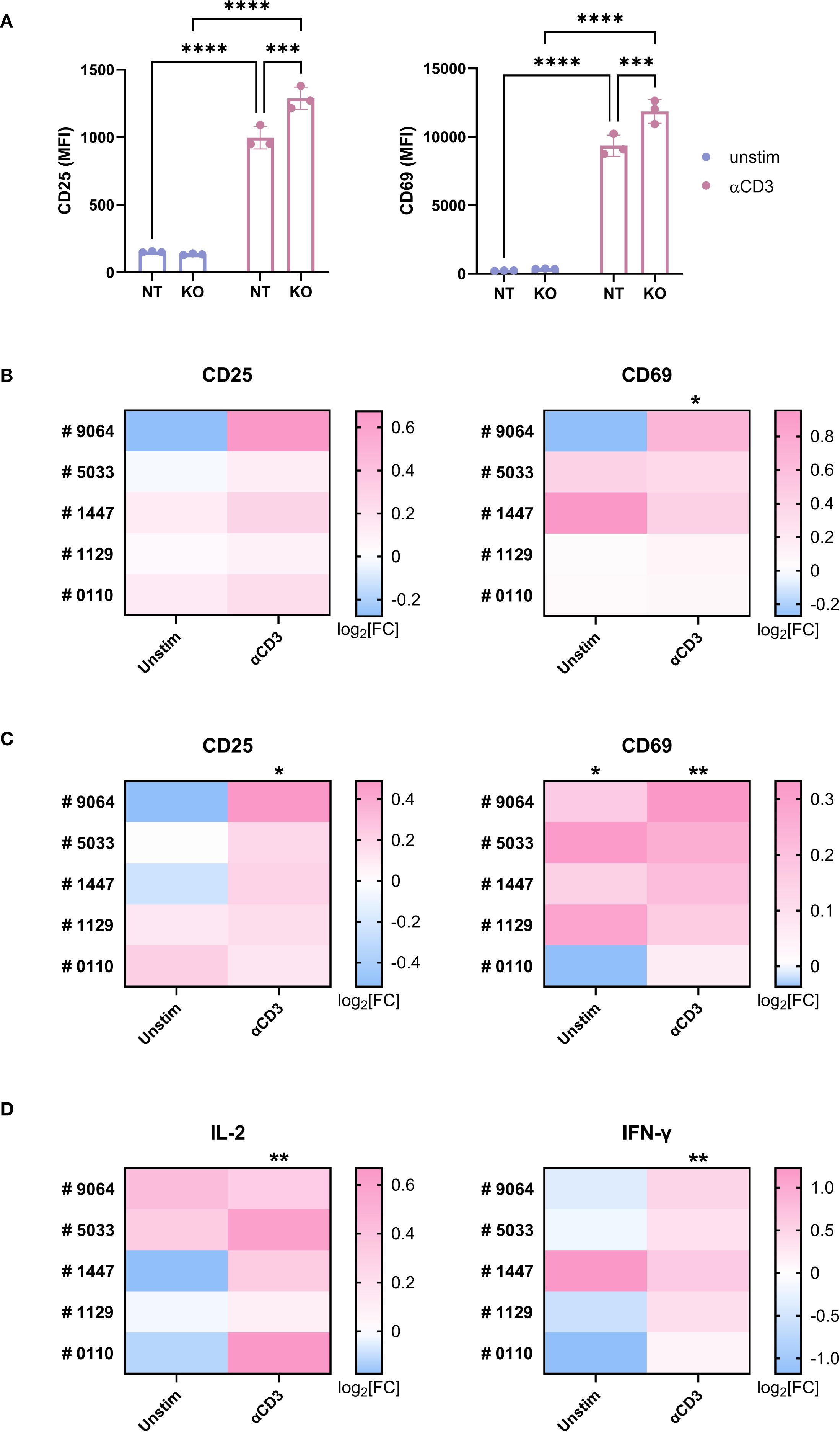A similar trend was also observed in primary human T cells (Supplementary Figure 4B). Knocking out TAGAP significantly increased CD25 and CD69 levels in both CD4+ (Figure 3B) and CD8+ (Figure 3C) T cells upon anti-CD3 stimulation. In addition, KO pan T cells secreted higher amounts of IL-2 and IFN-γ at Days 1 and 3 post anti-CD3 stimulation (Figure 3D).