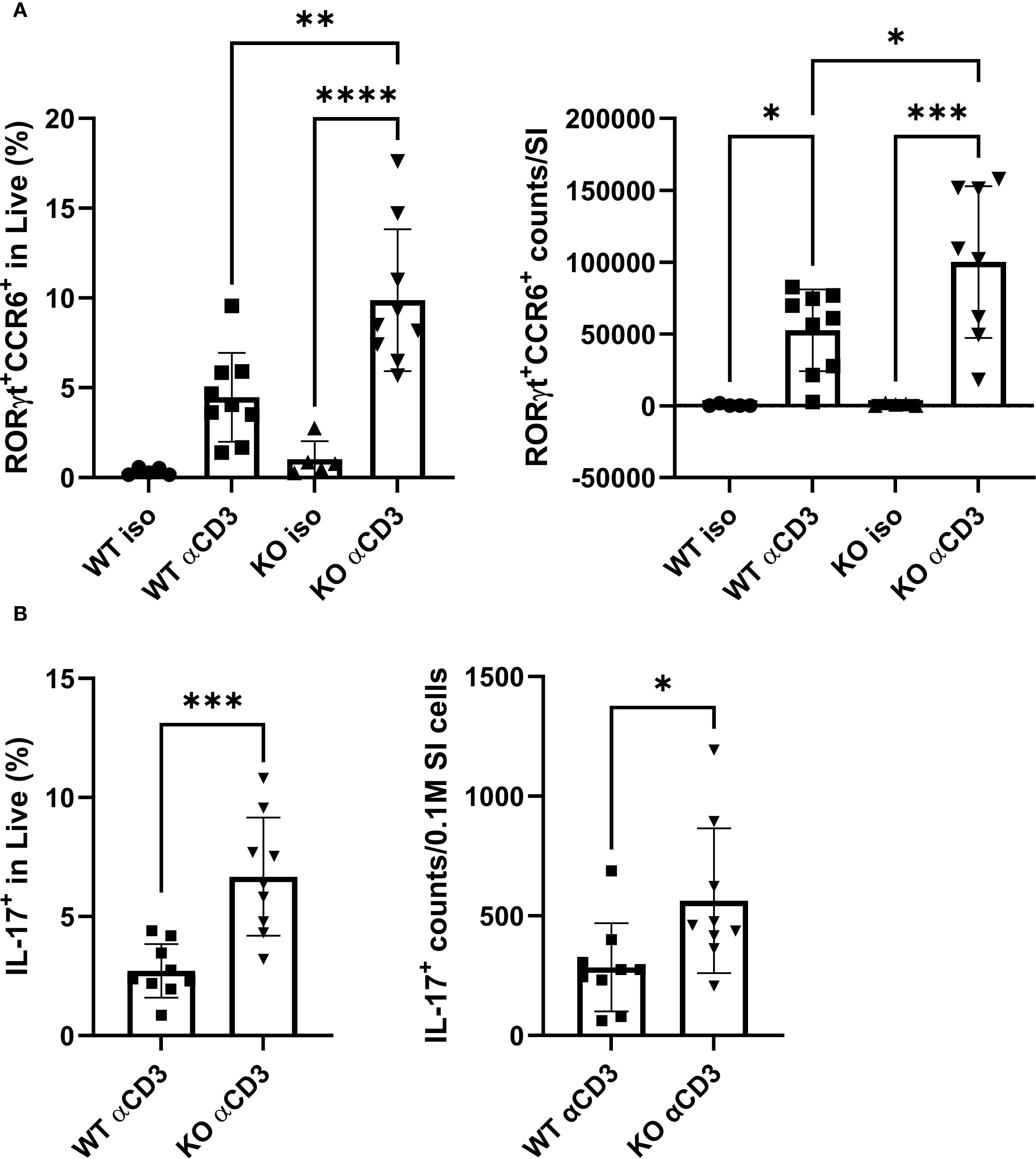 Figure 4. TAGAP regulates Th17 cell expansion in SI LP in response to in vivo TCR stimulation. (A) The percentage (left) and counts (right) of RORγt+CCR6+ cells in SI LP from WT or TAGAP KO mice subjected to isotype control antibodies or anti-CD3 antibodies (n = 5 or 9; **P < 0.01, *P < 0.05 using one-way ANOVA test followed by the post-hoc Sidak multiple comparisons test). (B) The percentage (left) and counts (right) of IL-17A+ cells in SI LP. SI LPL from WT or TAGAP KO mice subjected to isotype control antibodies or anti-CD3 antibodies were ex vivo stimulated with a cell stimulation cocktail for 4 hr (n = 9; ***P < 0.001 using Student’s t-test). All n-numbers represent data derived from separate mice with data plotted as mean ± SD. WT, wild-type; KO, TAGAP-deficient; iso, isotype control antibodies. ****p<0.0001.