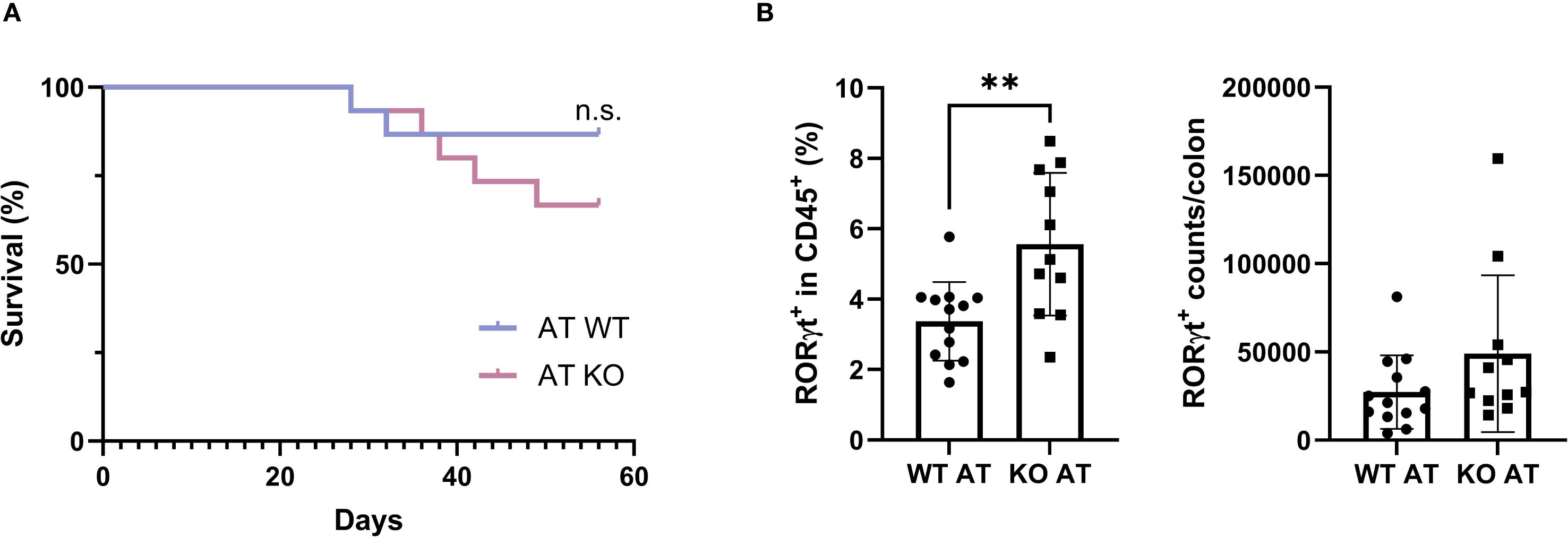 Figure 5. TAGAP controls Th17 cell colonization in the colon of mice with chronic colitis. (A) The Kaplan–Meier survival plot of Rag2-/- mice transfused with WT or TAGAP KO CD4+CD45RBhi T cells (n = 11 or 13; P value calculated using Log-rank test). (B) The percentage (left) and counts (right) of RORγt+ cells in colon IEL from Rag2-/- mice transfused with WT or TAGAP KO CD4+CD45RBhi T cells (n = 11 or 13; **P < 0.01 using Student’s t-test). All n-numbers represent data derived from separate mice with data plotted as mean ± SD. WT AT, adoptively transferred with wild-type CD4+CD45RBhi T cells; KO AT, adoptively transferred with TAGAP-deficient CD4+CD45RBhi T cells.