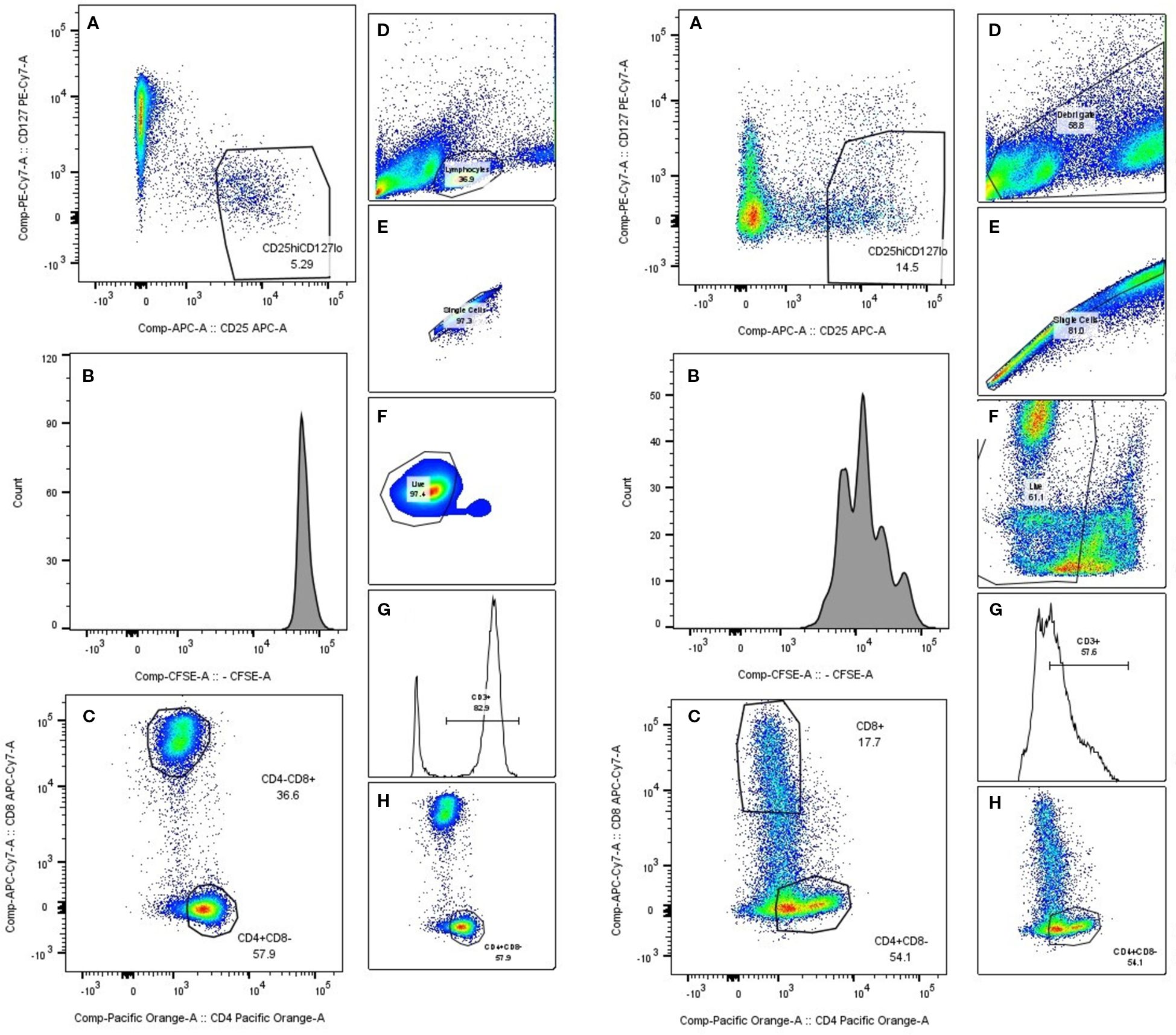 Figure 1. PBMC gating. A representative gating schematic. On the left side collage of PHA unstimulated PBMCs. Right side stimulated PBMCs. (A) Treg selection, (B) CFSE histogram, (C, H) CD4/CD8 selection, (D) lymphocyte population selection based on size and scatter, (E) singlet gate, (F) live cell gate, (G) CD3 gate.