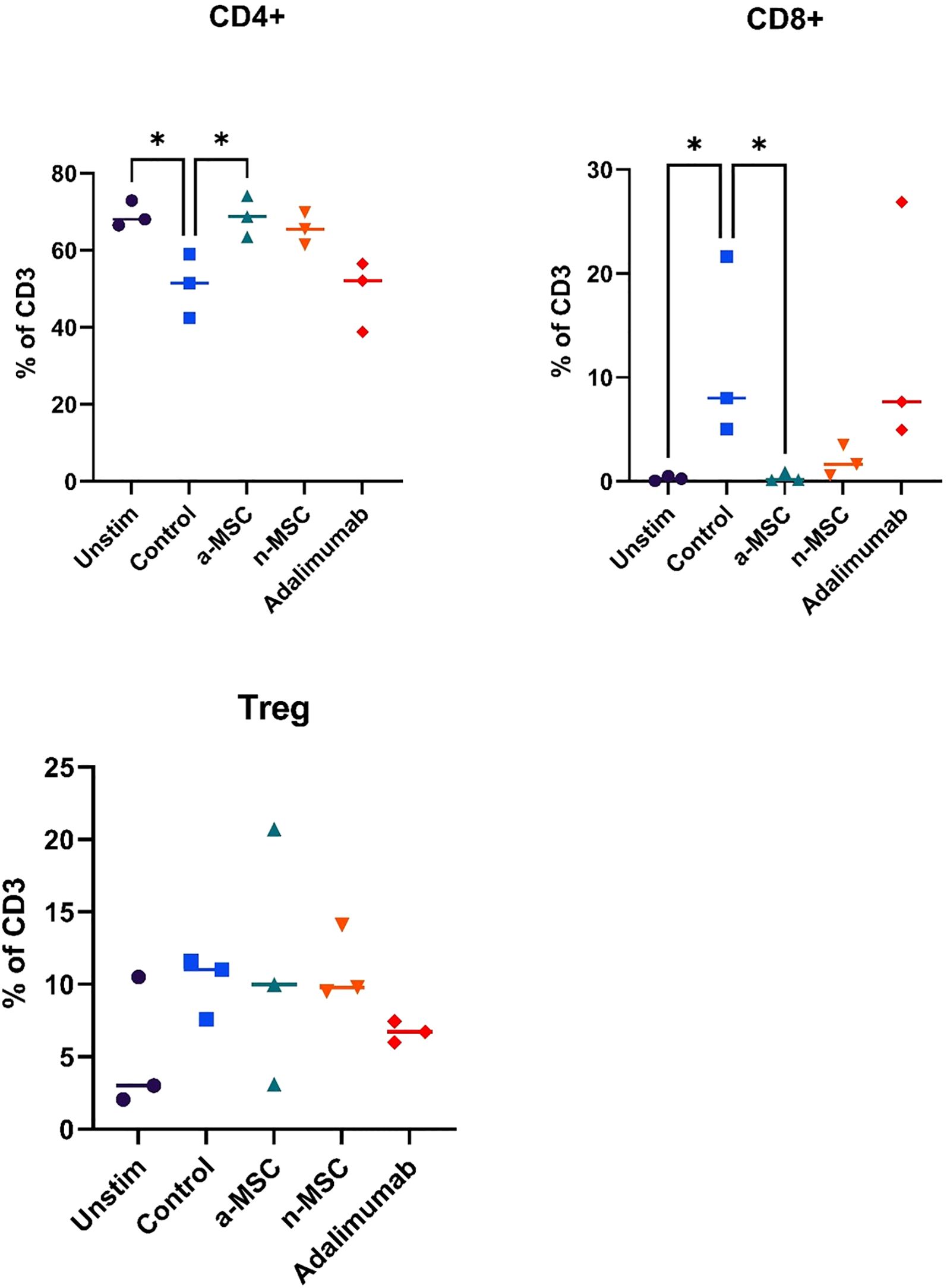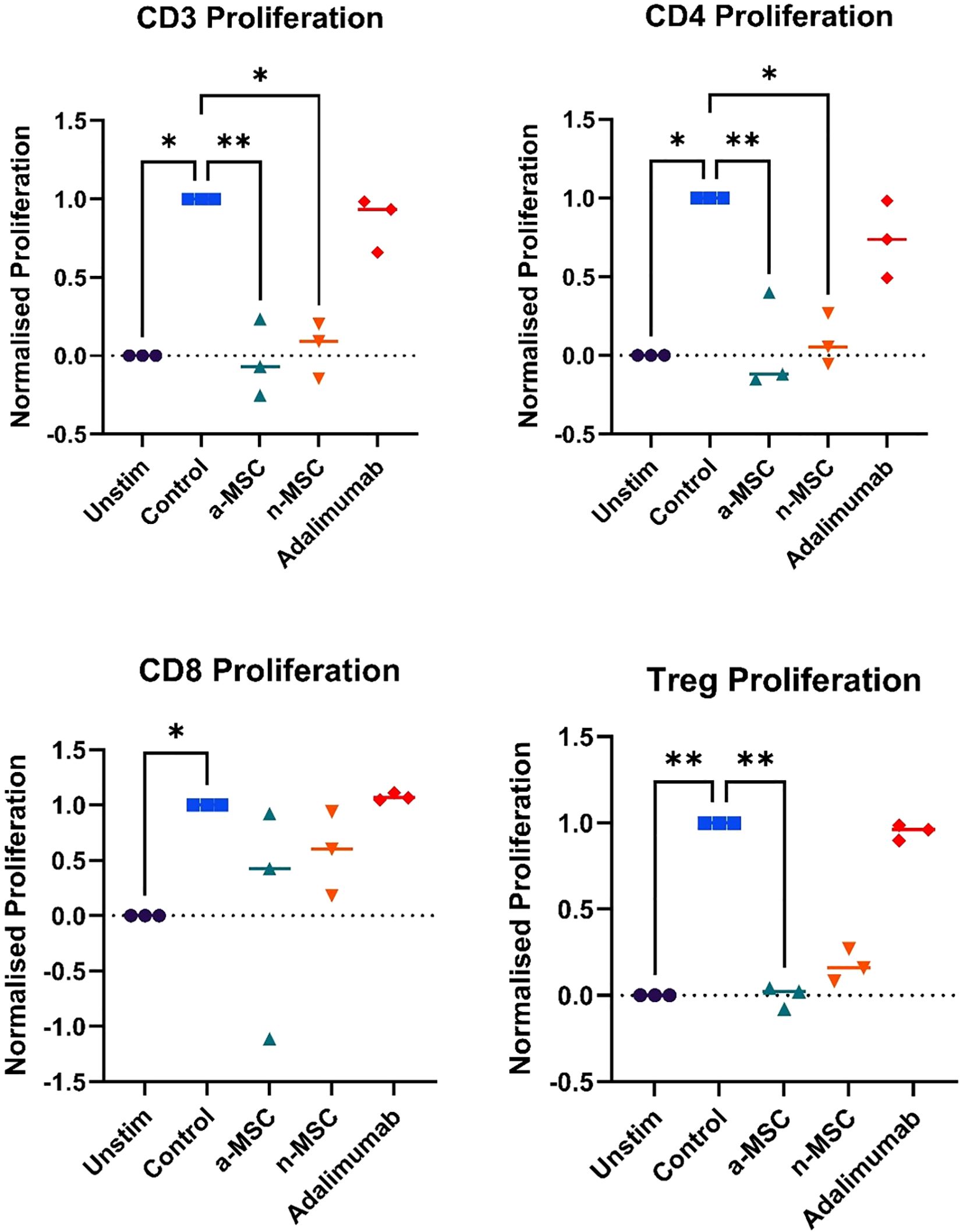 Stimulation of PBMCs with PHA resulted in robust lymphocyte proliferation, as seen in Figure 1B, while comparing unstimulated (left) and stimulated (right) samples, changes in the CFSE histogram show dilution of CFSE, resulting from cell division. Four peaks are seen in the stimulated sample, corresponding to four generations of cells. We compared lymphocyte proliferation and relative changes in CD4, CD8 and Treg populations across different interventions (Figures 1A, C, D–H). CFSE dye was used, which is diluted as the cell proliferates. Both n-MSCs and a-MSCs inhibited overall lymphocytes proliferation (Figure 2, CD3 proliferation), as well as CD4 and Treg lymphocyte proliferation. Tregs n-MSCs resulted in a tendency for reduction, which did not reach significance. There were no significant differences in CD8 lymphocyte proliferation. Adalimumab did not show a significant effect on the overall lymphocyte proliferation.
