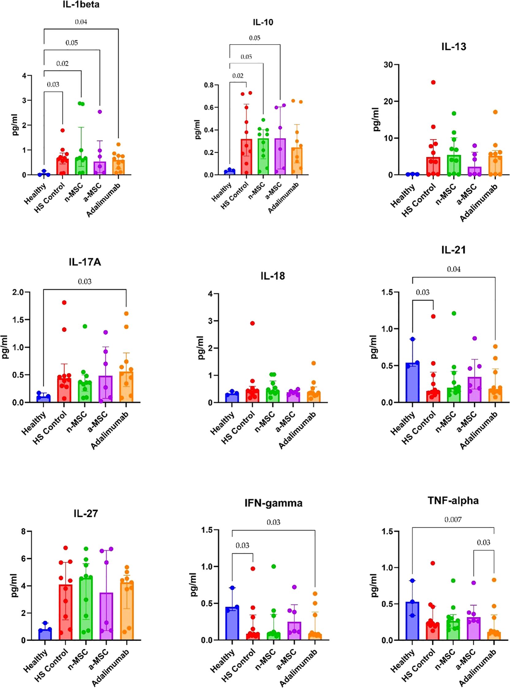 Figure 5. Cytokine concentrations in lesional skin biopsy samples. n = 3 for healthy subjects, n = 10 for adalimumab. a-MSCs, activated mesenchymal stem cells (n = 7); n-MSCs, naïve mesenchymal stem cells (n = 10); HS, hidradenitis suppurativa (n = 10); IFN, interferon; IL, interleukin; TNF, tumor necrosis factor. Measured in duplicates. Group differences were assessed using the Kruskal-Wallis test, followed by Dunn’s post hoc test for pairwise comparisons. Significant p-values (< 0.05) are indicated.