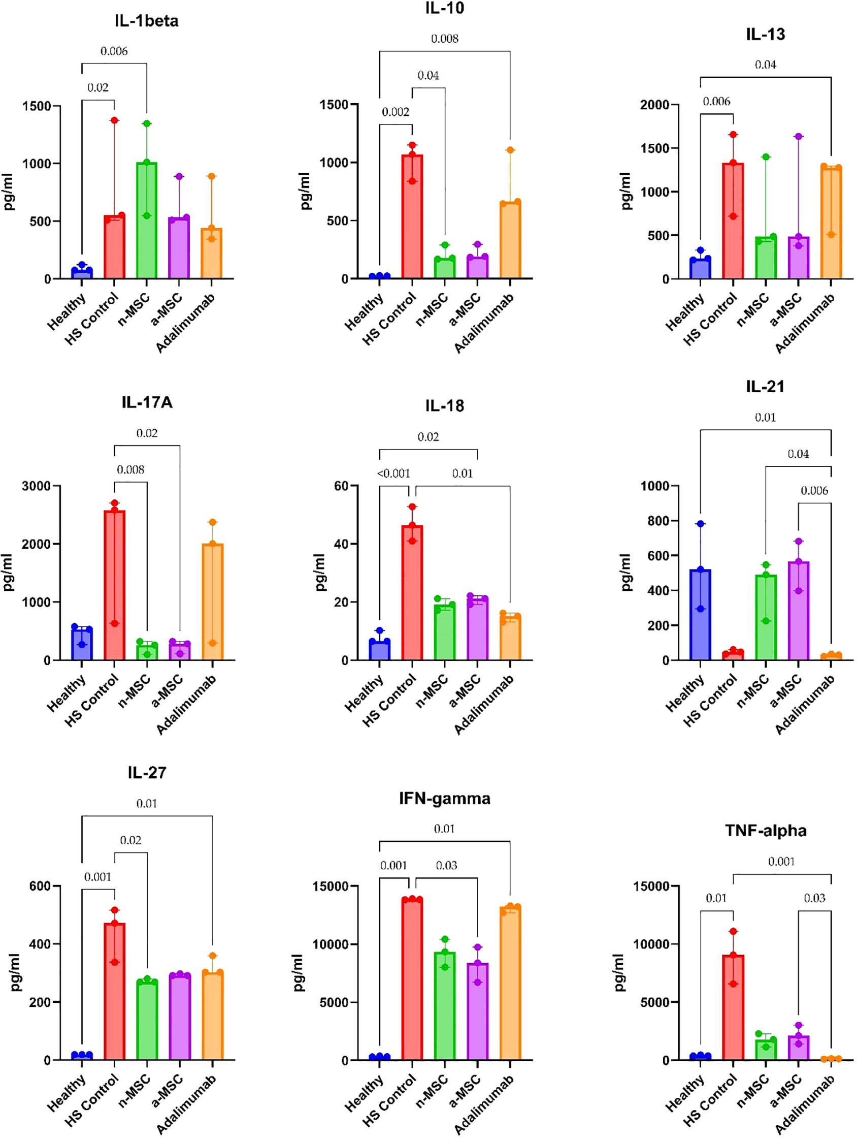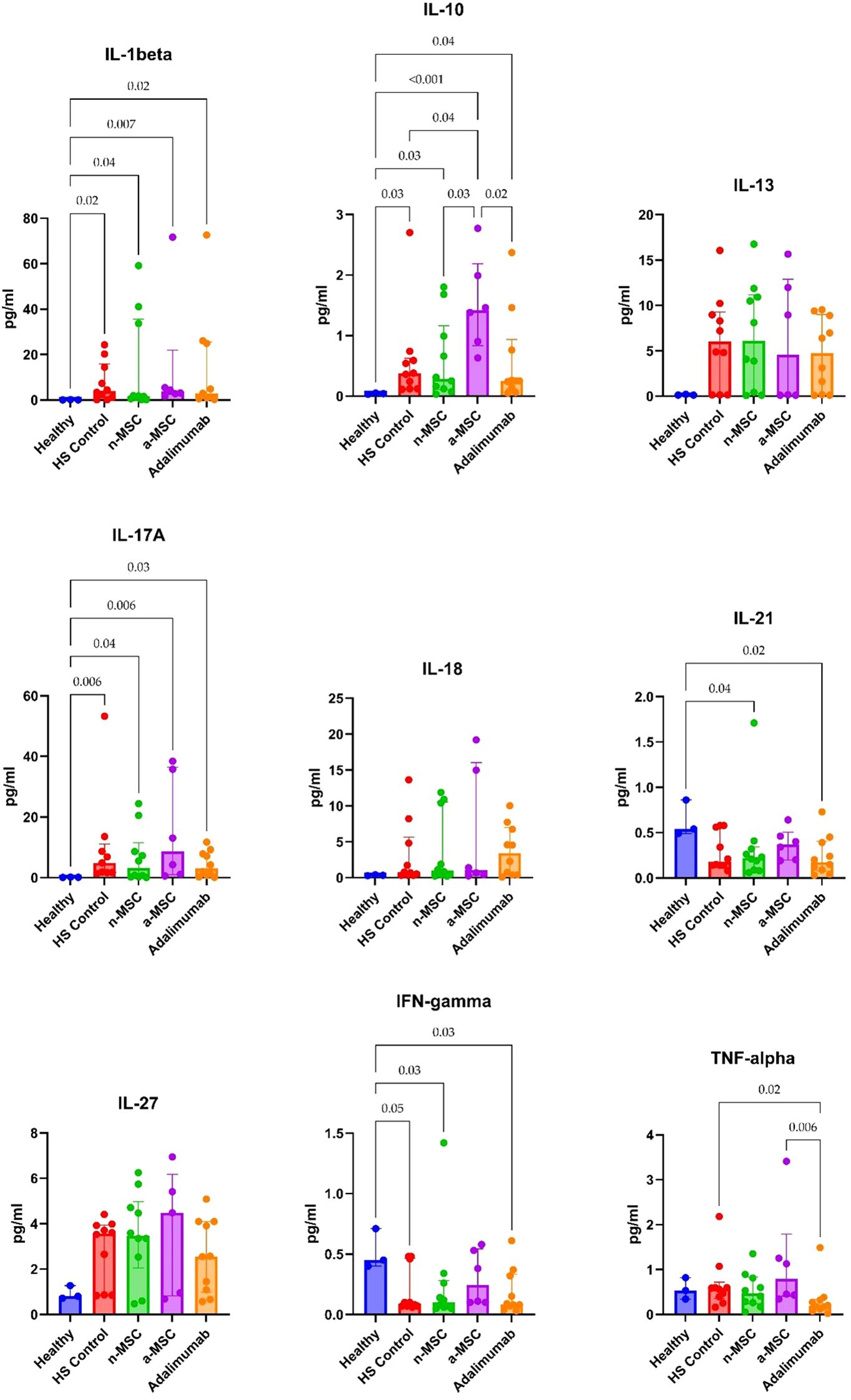 Cytokine concentration in PBMC supernatants from HS patients and healthy individuals was analyzed. HS patient PBMCs were subjected either to regular cell culture medium (HS control) or co-cultured with n-MSCs, a-MSCs or adalimumab. They produced greater amounts of cytokines after stimulation (Figure 4), which shows an aberrant systemic immune response. When comparing cytokine concentrations across different interventions, we found that a-MSCs statistically significantly reduced pro-inflammatory cytokines (IL-17A, IFN-γ) and anti-inflammatory IL-10 levels (Figure 4) when compared with HS control. Naive MSCs showed partial effects.