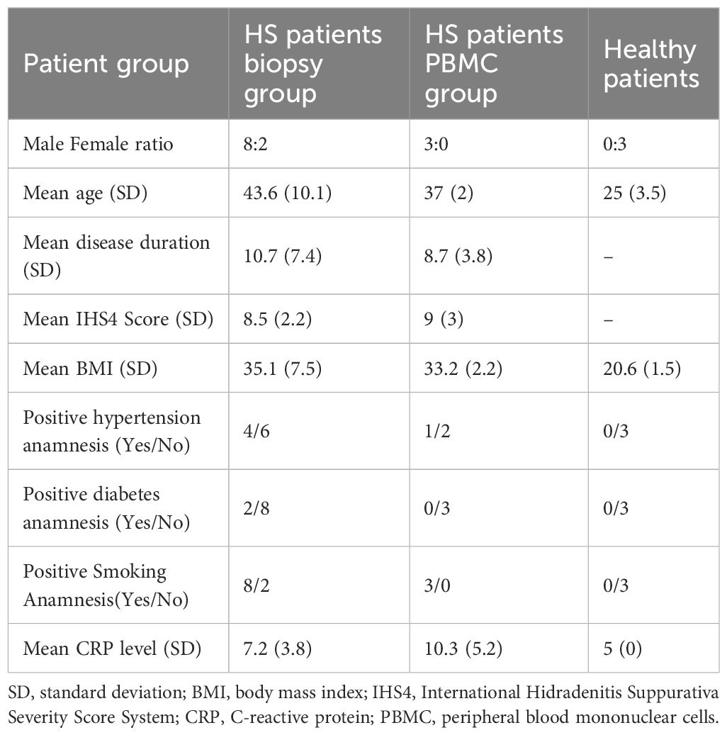 Ten HS patients at Hurley stage II were included in the study. All patients had not been treated with systemic antibiotics for at least 6 weeks prior to enrolment. They were also biologically naïve and did not have any other inflammatory disease. Patients exhibited at least moderate disease severity according to the IHS4 score. The clinical data indicate that our research cohort is representative of moderate or severe HS severity and relatively homogeneous [mean IHS4 score 8.5 (SD 2.2)] (Table 1). Four mm in diameter skin punch biopsies were taken from axillary HS lesional (inflammatory nodules) and HS perilesional (at a distance of ≥5 cm from visible HS inflammation area) skin areas (n=10). Three healthy control subjects (3 females, mean age 25 years, range 23–29 years) were included in the study, and 4 mm in diameter skin punch biopsies were taken from axillary healthy skin. Finally, the collection of blood samples from HS (n=3) and healthy (n=3) study subjects was conducted under aseptic conditions. Approval by the regional bio-ethics committee was obtained (Nr. BE-2-105), and each patient and control subject gave written informed consent.