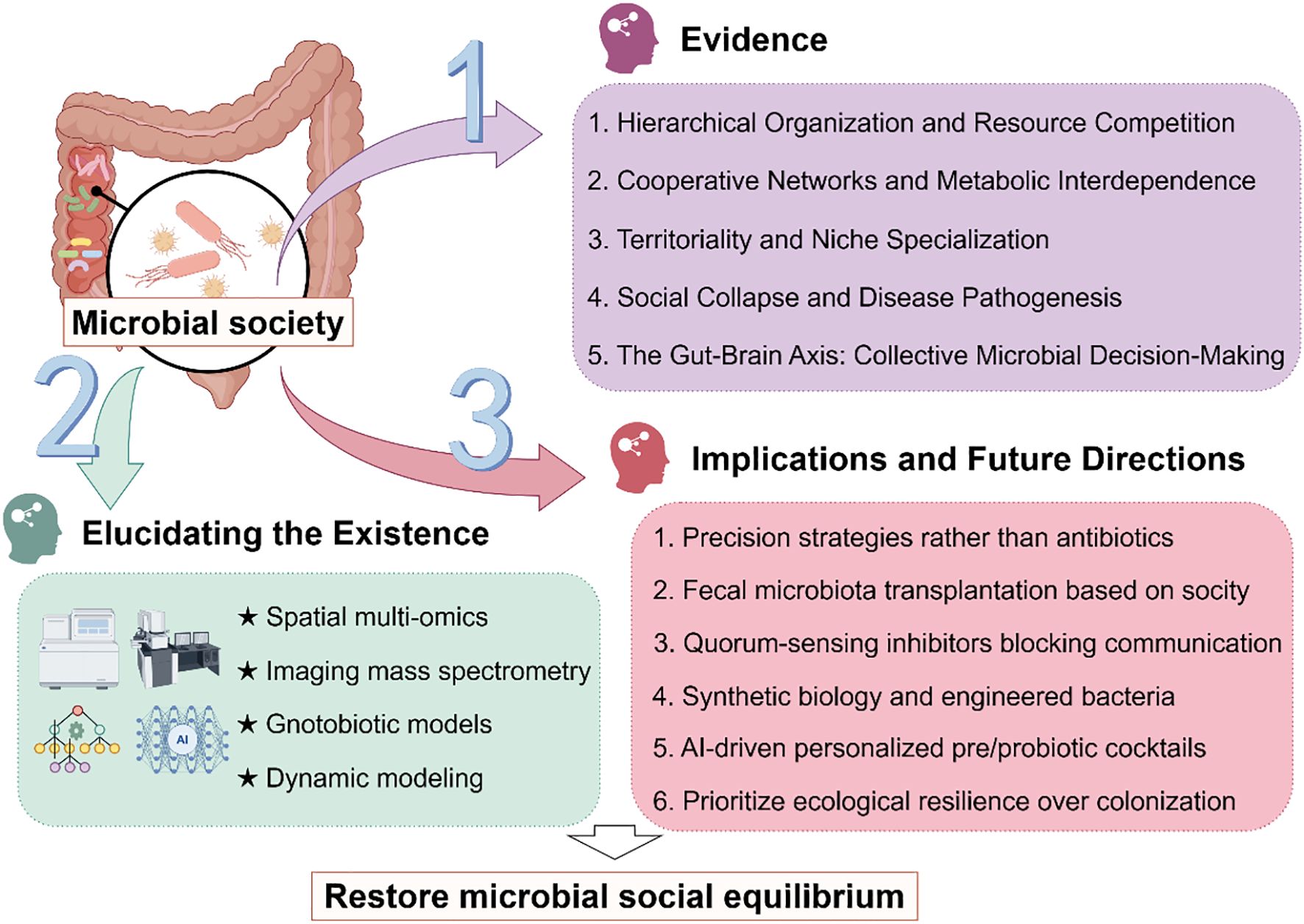 The human gut microbiota comprises complex microbial communities that interact dynamically to form intricate ecological networks (1). Emerging evidence suggests that these microbial populations do not exist as random assemblages but may instead self-organize into structured social architectures characterized by hierarchical dominance, mutualistic alliances, and niche-driven territoriality (2). Such organization is critical for maintaining gut homeostasis, with disruptions to these social structures potentially contributing to dysbiosis-associated diseases, including inflammatory bowel disease (3), metabolic disorders (4), and neurological disorders (5). The stability of these microbial social frameworks is maintained through sophisticated communication mechanisms, such as quorum sensing and metabolite exchange (6), which facilitate cooperation, competition, and spatial organization. Furthermore, host-related factors—including anatomical constraints (7), dietary inputs (8), and immune-mediated selection pressures (9)—play a pivotal role in shaping these microbial interactions. Despite growing recognition of the gut microbiota’s social dynamics, the precise rules governing their organization and how their breakdown leads to disease remain incompletely understood (10). Therefore, we propose the hypothesis that gut microbiota communities exhibit socially structured behaviors analogous to macro-ecological systems and that disturbances in these organizational principles underlie pathological dysbiosis. By elucidating these mechanisms, this perspective paper aims to provide novel insights into microbiome-based therapeutic strategies (Figure 1).