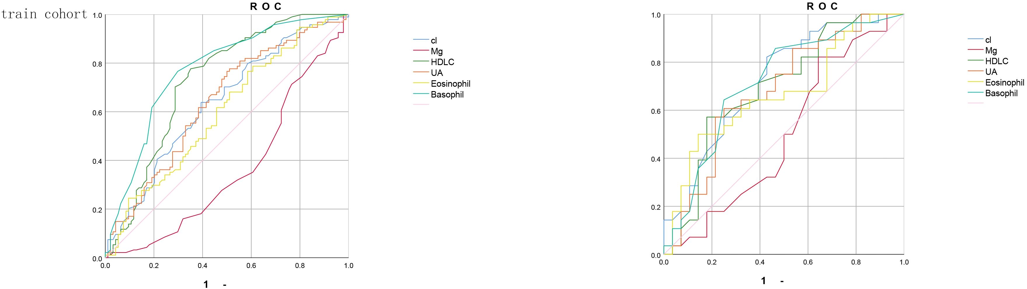 Figure 2. The receiver operating characteristic (ROC) curve of training cohort and validation cohort. (ROC) curves assessing the discriminative ability of six individual predictors-Cl (blue), Mg (red), high-density lipoprotein cholesterol (HDL-C, green), uric acid (UA, orange), eosinophil count (yellow) and basophil count (teal)—for the outcome of interest. (A) shows the ROC analysis in the training cohort, and (B) shows the ROC analysis in the independent validation cohort. The diagonal reference line (pink) represents an area under the curve (AUC) of 0.5, indicating no discriminatory power.