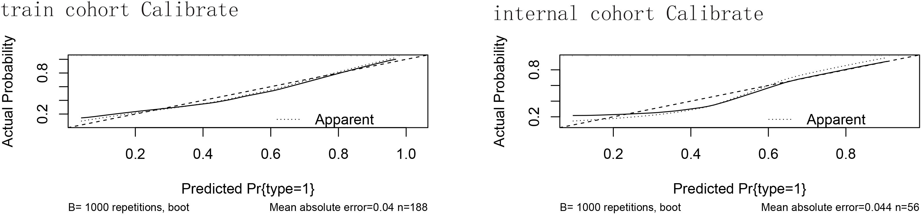 Figure 3. The calibration of the training cohort and the validation cohort. Calibration curves for the predictive nomogram in (A) the training cohort (n = 188) and (B) the internal validation cohort (n = 56). The x-axis shows the nomogram‐predicted probability of GBM occurrence, and the y-axis shows the observed (actual) probability. The 45° diagonal line represents perfect calibration. The dotted curve (“Apparent”) is the calibration of the original sample; the dashed curve is the bootstrap‐corrected calibration (B = 1000 repetitions); and the solid curve shows the ideal calibration. Mean absolute error values are reported beneath each plot. Hosmer–Lemeshow test showed no significant lack of fit in either cohort; mean absolute errors were minimal.