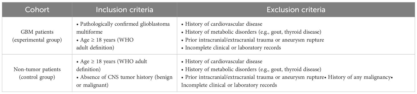 To screen and select GBM and control patients according to predefined inclusion and exclusion criteria for this retrospective analysis. Based on the conception of the experiment, data were collected from all included patients, and this study was approved by Guangdong Provincial People’s Hospital. All patients were carefully screened according to the following inclusion criteria (14): Experimental group: (a) patients diagnosed by pathological findings; (b) no history of cardiac disease; (c) no history of metabolic disease, such as gout, thyroid disease, etc.; (d) adults according to the latest WHO definition; (e) no trauma or rupture of aneurysm, etc. Control group:(a) diagnosed with vascular disease (e.g., aneurysm, arteriovenous malformation, etc.) or functional neurosurgical disease (e.g., trigeminal neuralgia, facial muscle spasm, etc.); (b) not accompanied by history of cardiac disease; (c) not accompanied by history of metabolic disease, such as gout, thyroid disease, etc.; (d) adults according to the most recent WHO definition; (e) not accompanied with trauma or rupture of aneurysm, etc.; and (f) not accompanied by history of tumor. Finally, 94 patients with GBM diagnosed in the Department of Neurosurgery of Guangdong Provincial People’s Hospital from 2016 to 2023 and 94 control patients were included in this retrospective study. The inclusion and exclusion criteria for the GBM and non-tumor (control) cohorts are summarized in Table 1.