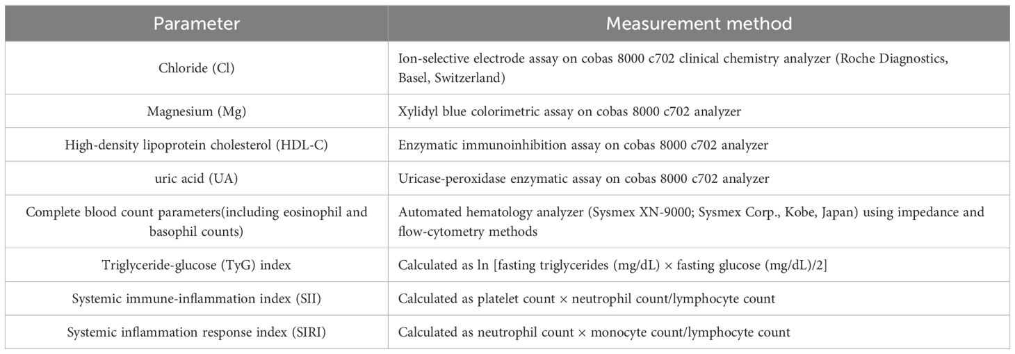 Given that tumor development involves profound remodeling of both the metabolic and immune microenvironments, previous studies have reported associations between GBM and alterations in various electrolytes, metabolites, and immune cell populations (15–20). Based on this evidence, we selected a set of representative clinical and laboratory parameters for further investigation in this study.